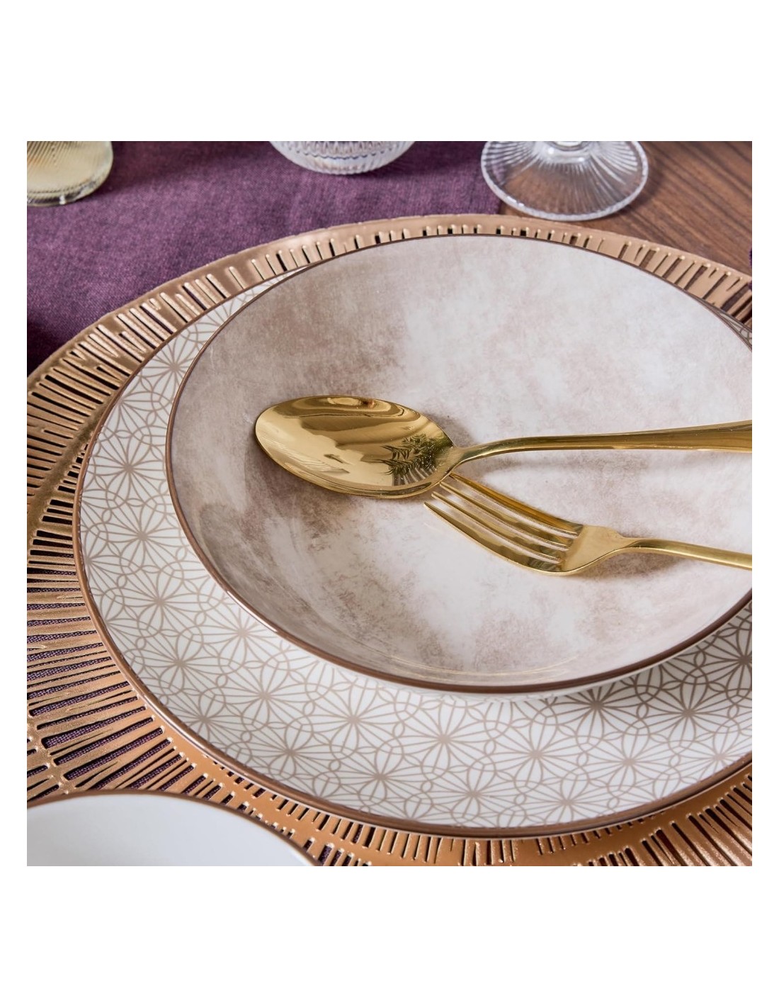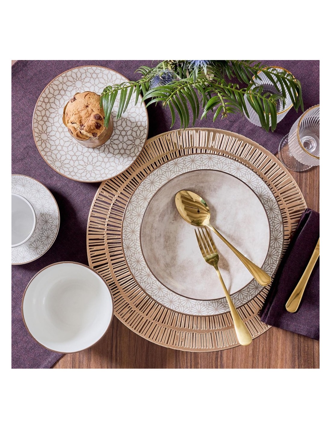 Il motivo geometrico dai toni naturali dona alla tavola un aspetto armonioso e contemporaneo, valorizzando ogni portata e creando un’atmosfera accogliente e sofisticata che cattura l’attenzione degli ospiti.