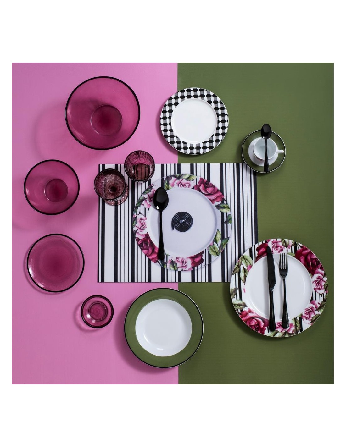 Il servizio da tavola Roseline, è un omaggio alla femminilità, dai dettagli ricercati, la sinuosità delle linee e delle fantasie colorate incontra il bianco e nero.