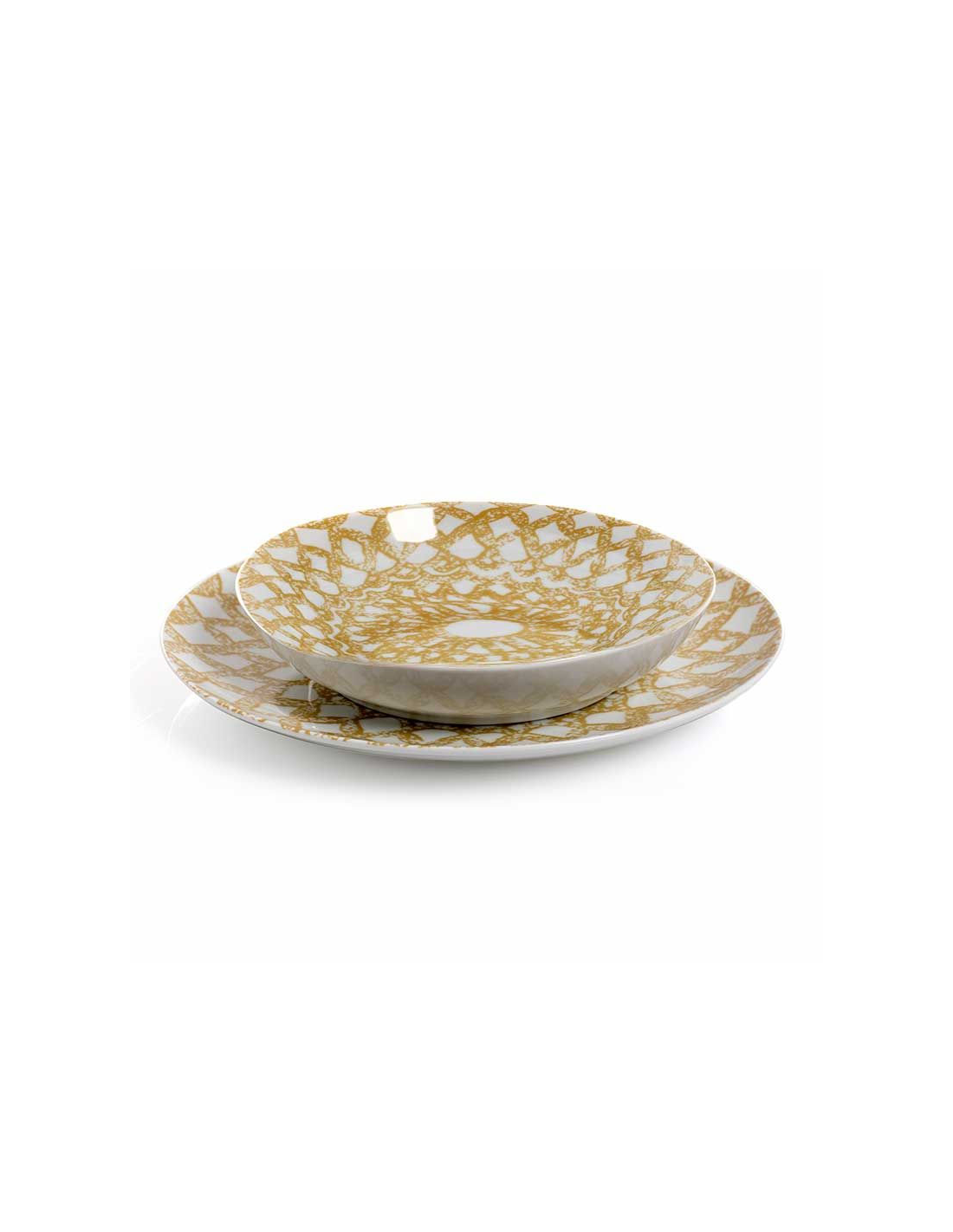 Servizio piatti per 6 persone, realizzato in porcellana con decori arabeschi e geometrici che si ispira a tradizioni mediterranee, perfetto per chi desidera apparecchiare una tavola con gusto e originalità.