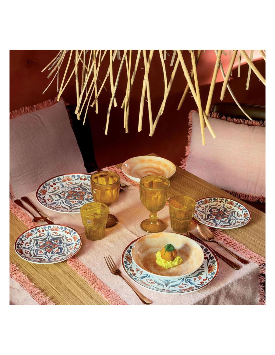 Il servizio piatti Albatros di Andrea Fontebasso porta a tavola le maioliche latine intrecciate a sfumature color ambra e marrone, che richiamano i colori della terra. Ideali per mise en place estive dai toni naturali e caldi.