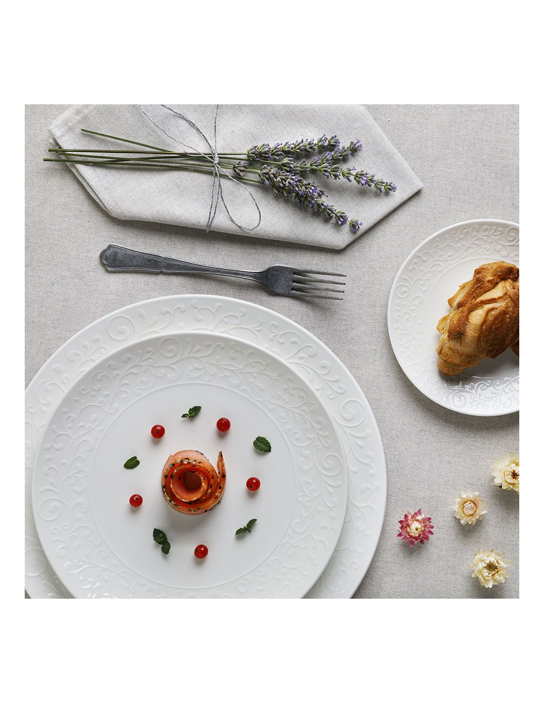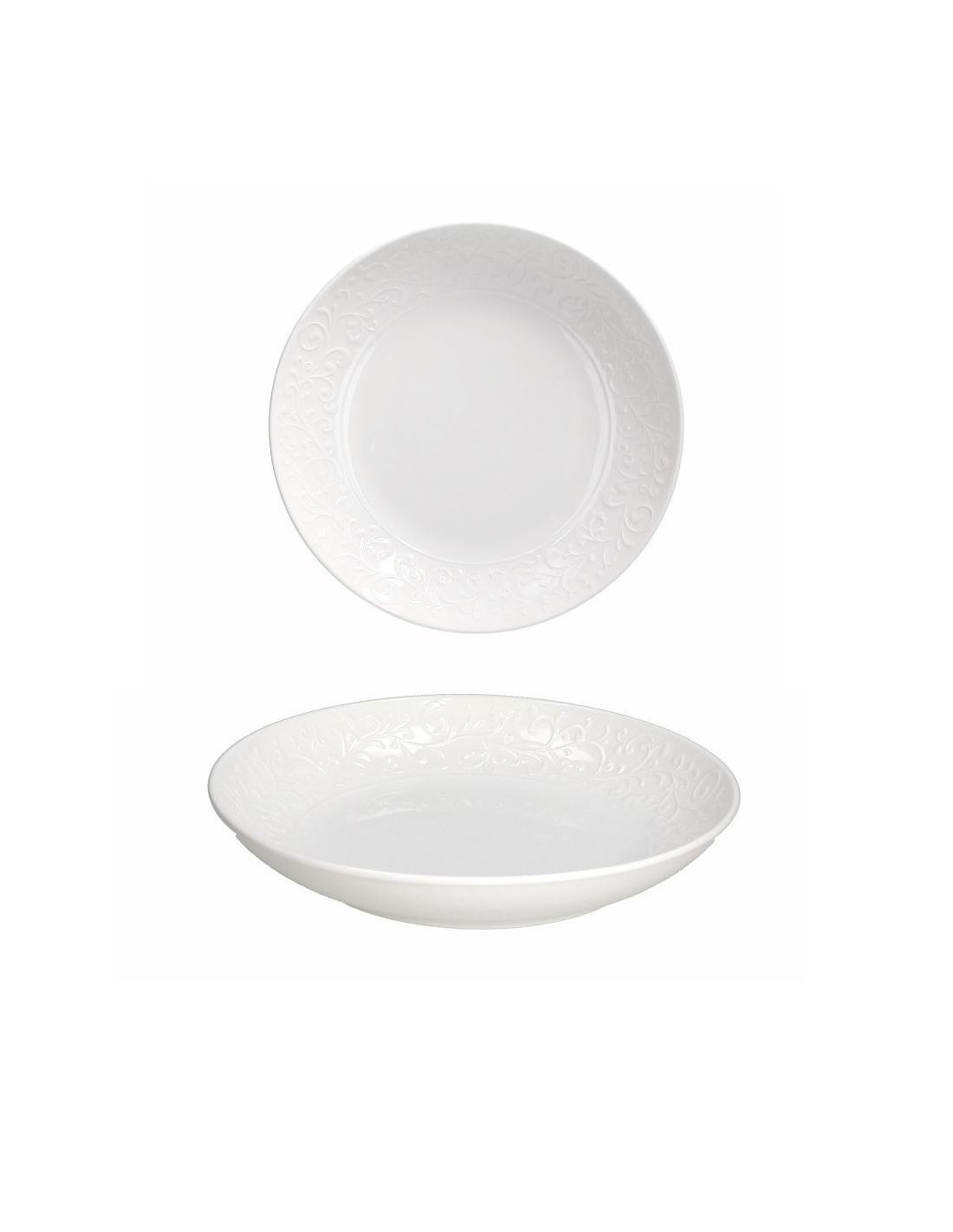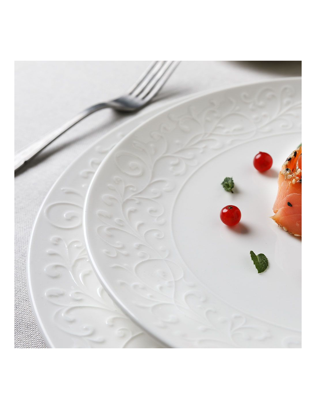 Servizio in porcellana bianca con decoro sui bordi a rilievo.