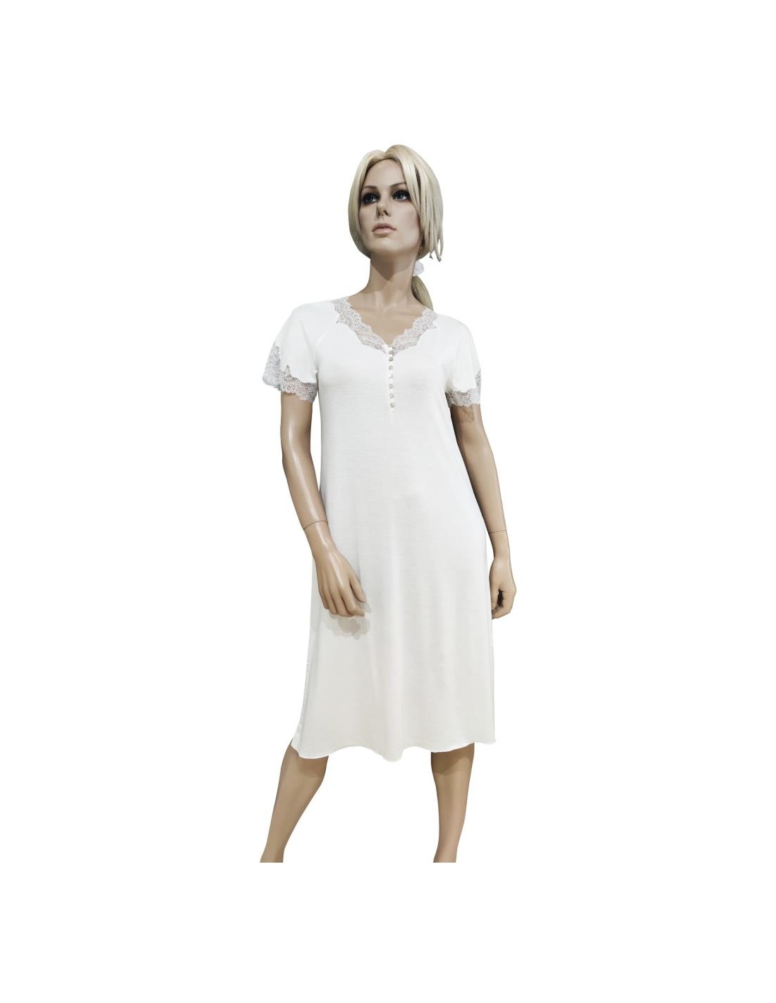 Camicia da notte Donna in tessuto micromodal, collo a serafino con 8 bottoni in madreperla, manica corta, rifinizioni con inserti in pura Seta e pizzo leavers.