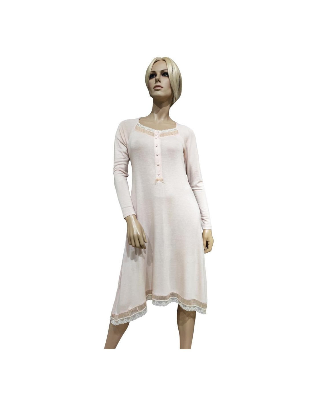 Collo rifinito con pizzo a serafino 7 bottoni e manica lunga.