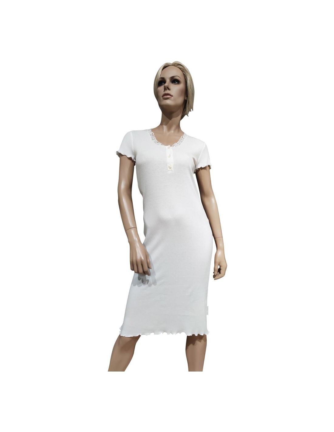 Camicia da notte donna in Cotone Modal, rifinita con inserti in pizzo macramè, collo a serafino 3 bottoni e manica corta.