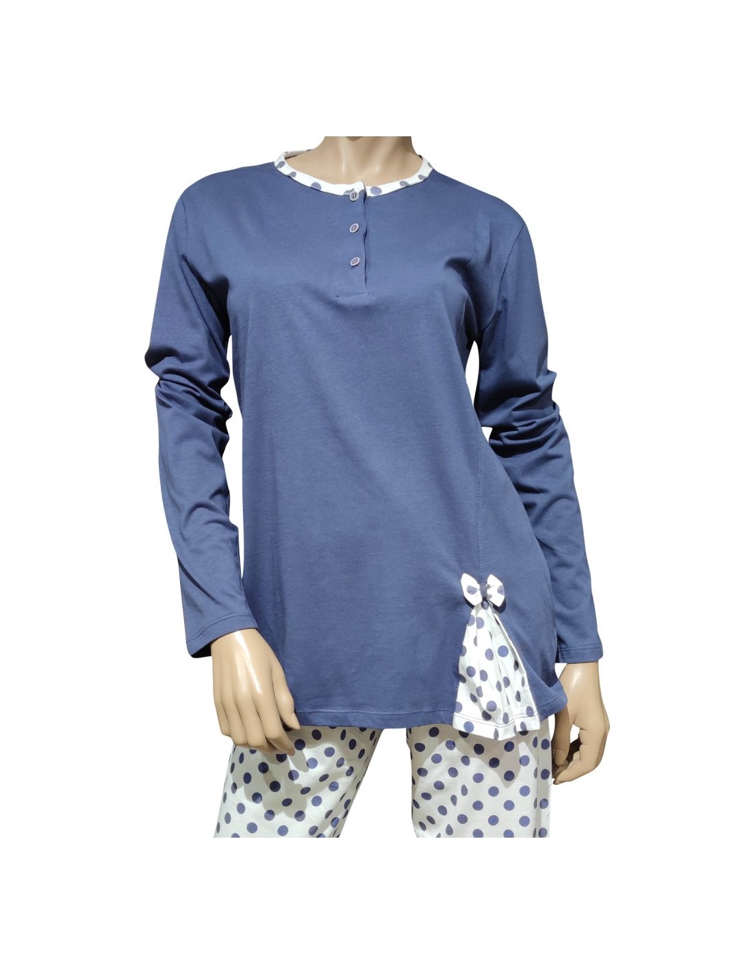 Top a serafino 3 bottoni, manica lunga e pantalone lungo fantasia pois.