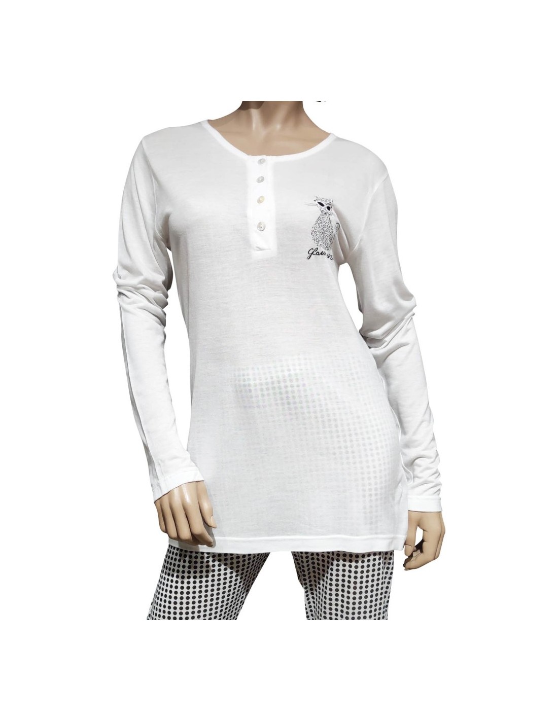 Top a serafino 4 bottoni, manica lunga e pantalone lungo a pois con polsini.