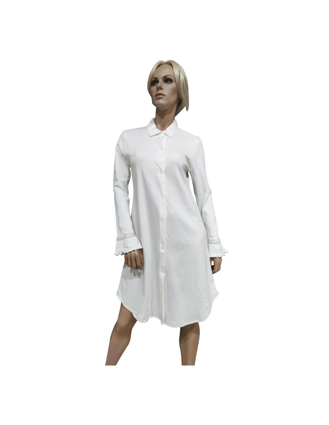 Chiusura a Bottoni, colletto e manica lunga rifinita con pizzo.