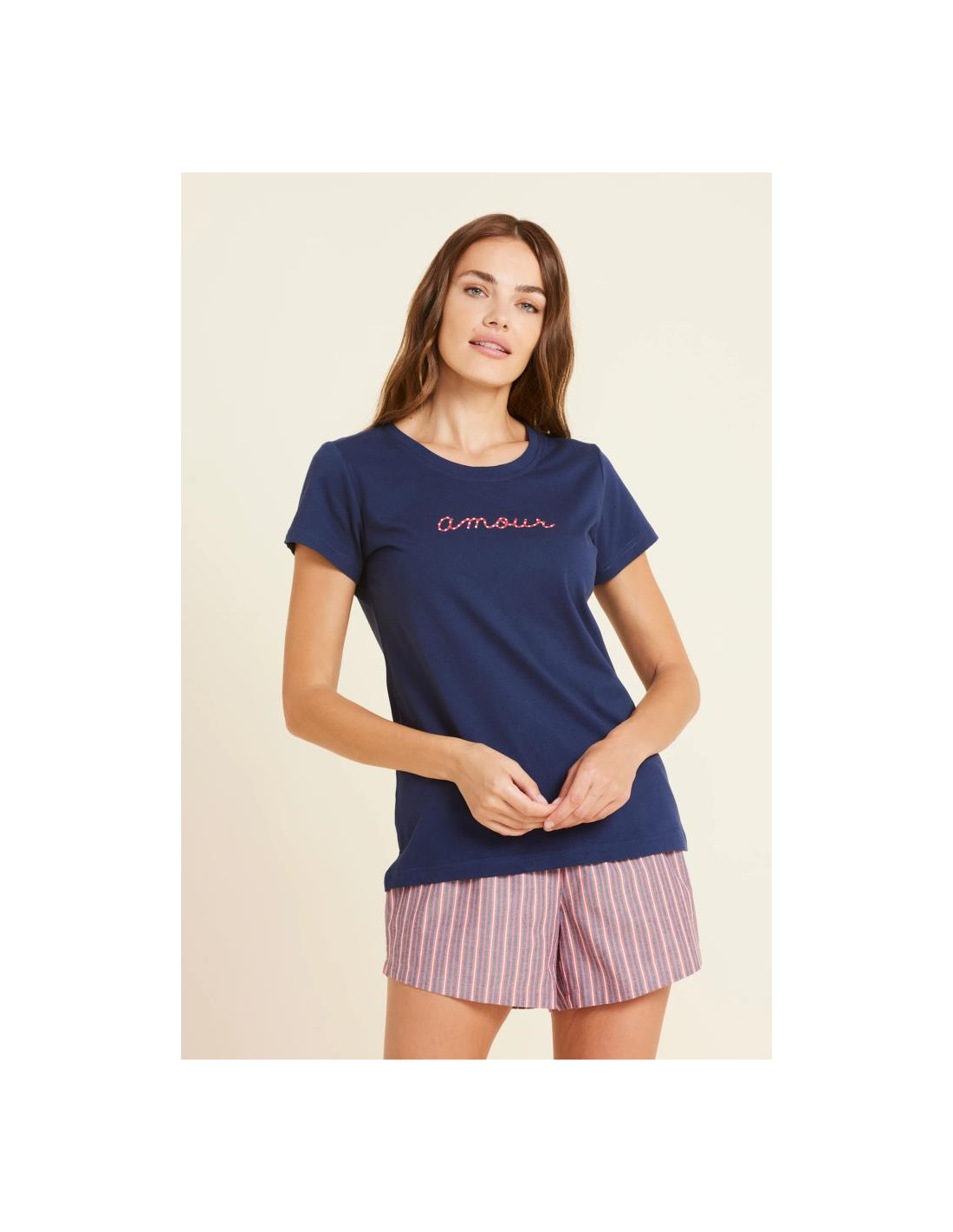 Maglia girocollo, maniche corte e pantaloncino corto a righe.