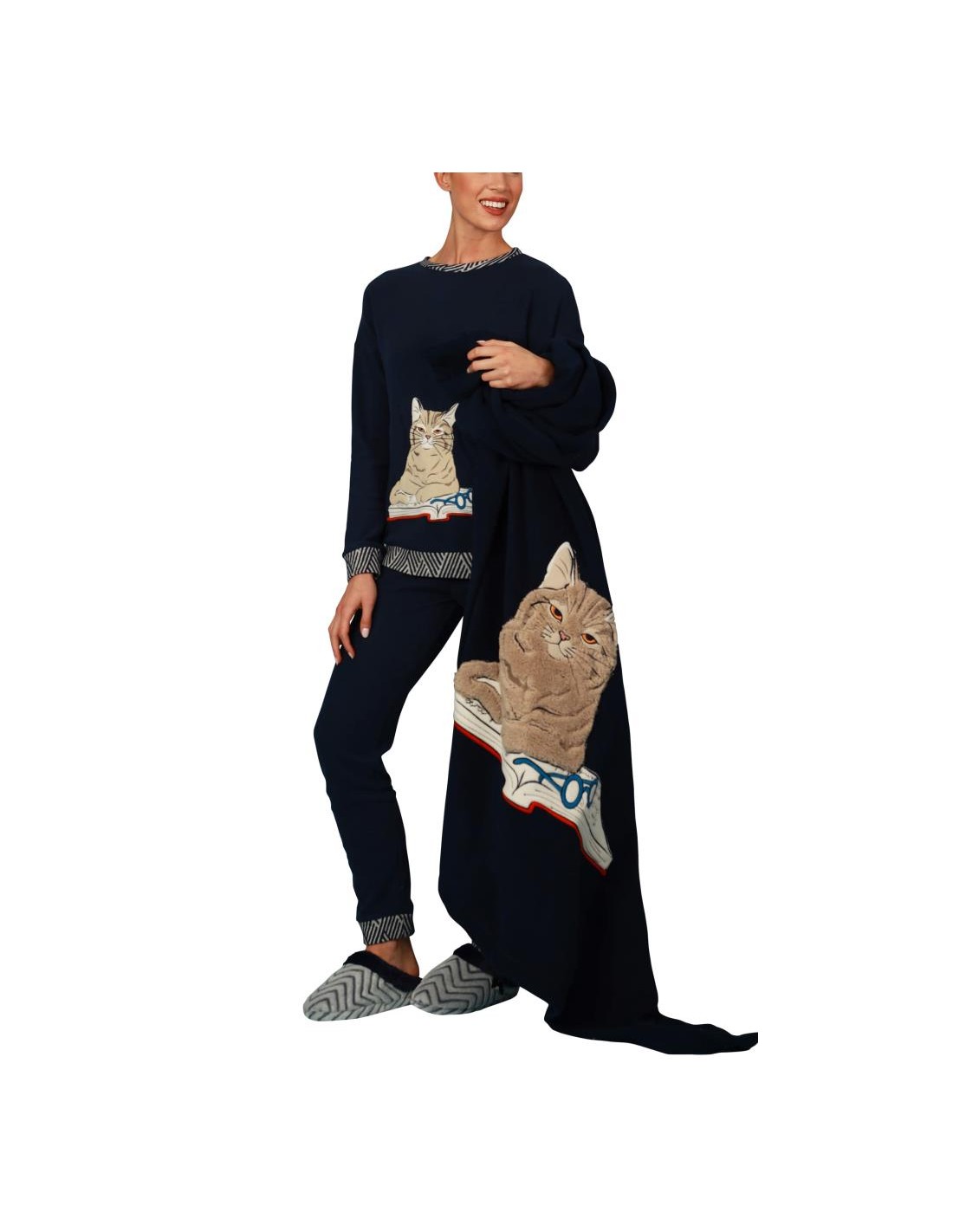 Pigiama Donna invernale in caldo Punto Milano con gatto applicato e ricamato.