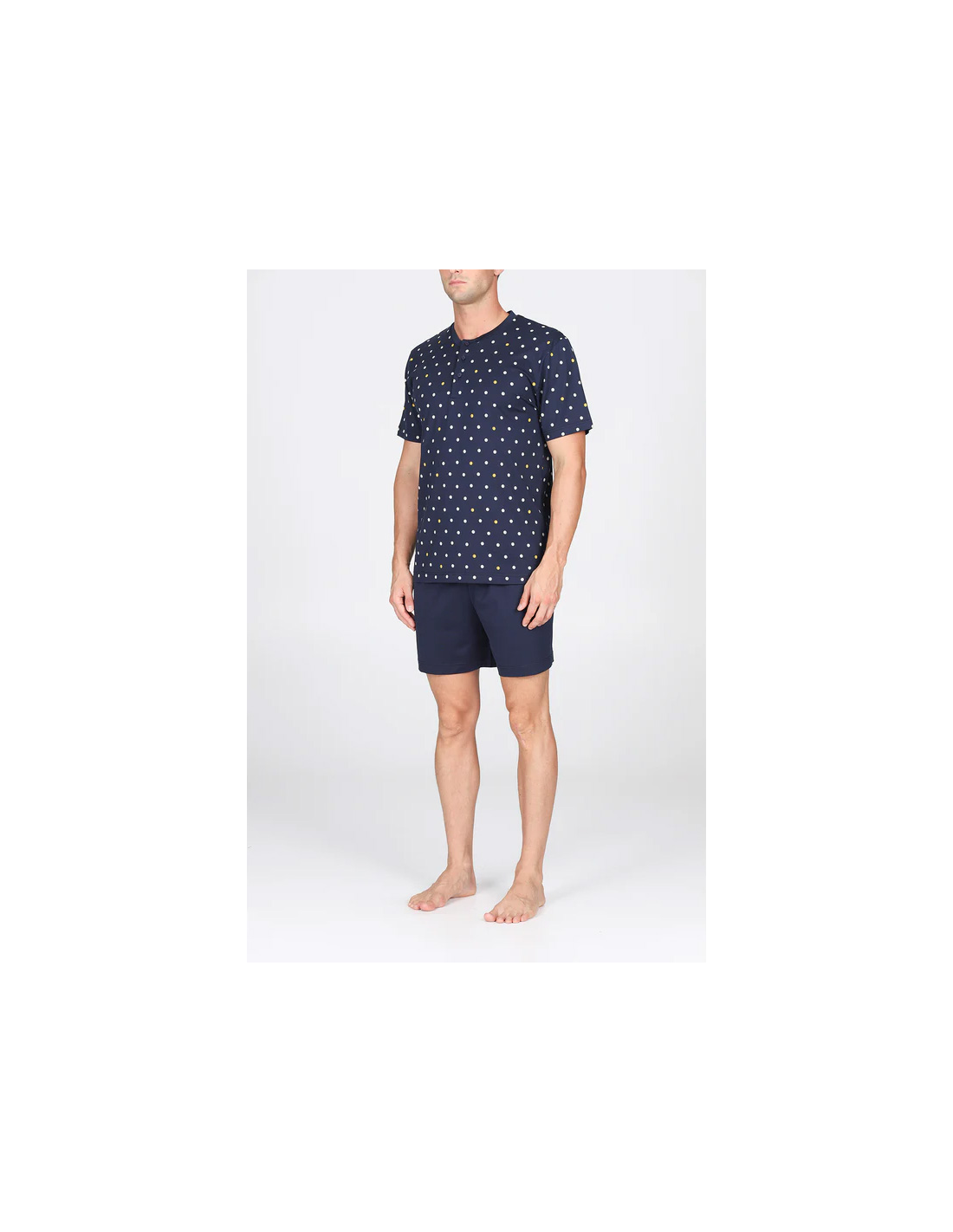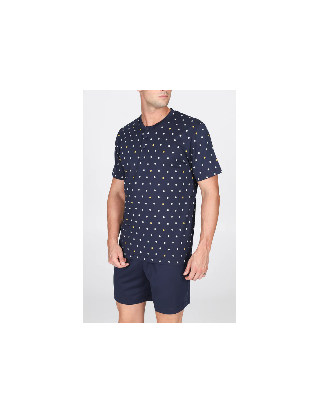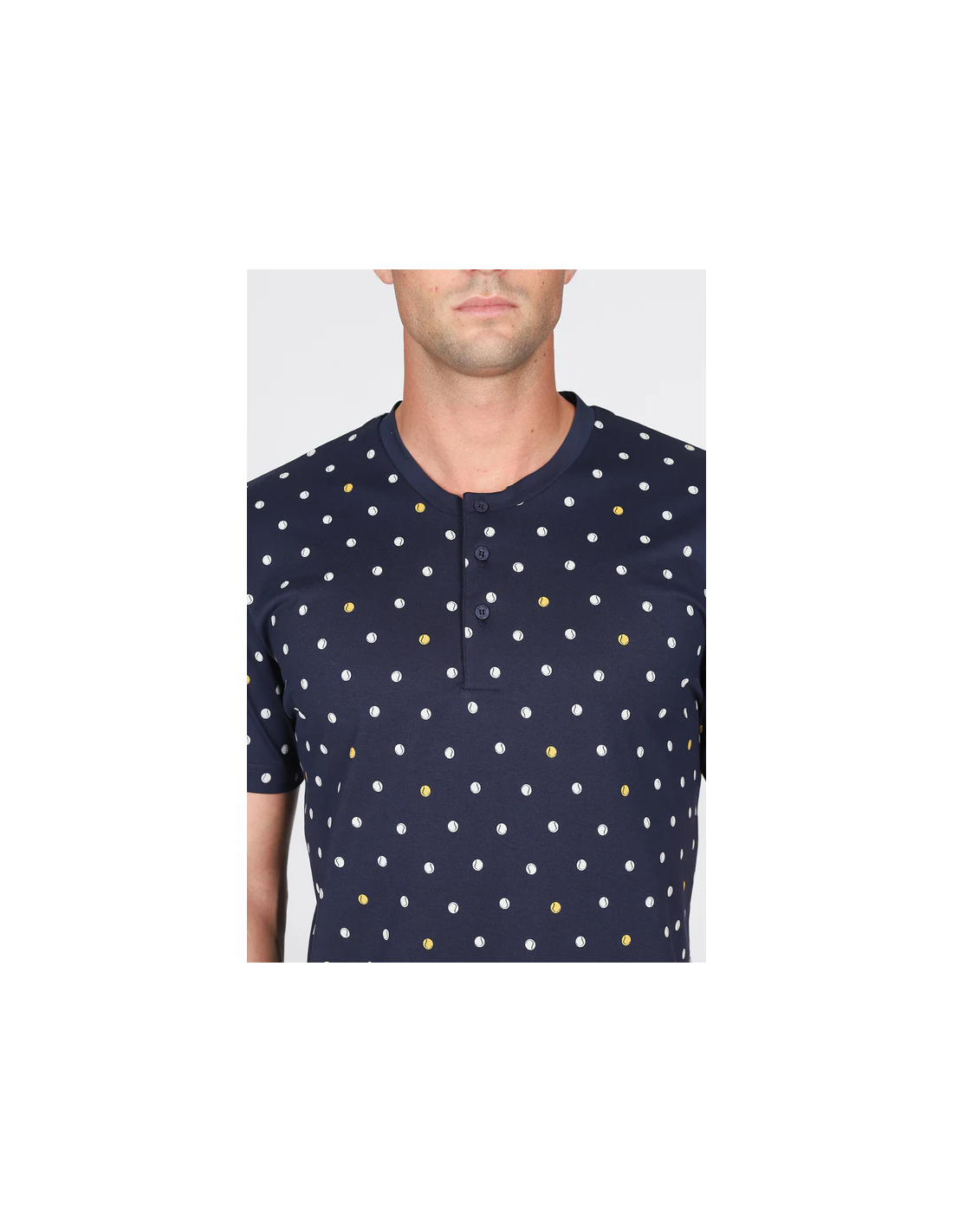 Pigiama corto uomo, in fresco jersey 80/2 di puro cotone gasato, doppio ritorto: estremamente leggero consistente e morbido. Particolarmente adatto a soddisfare la richiesta di qualità del consumatore più esigente. Maglia con collo a serafino in fantasia "Palline tennis", pantaloncini in tinta unita blu.