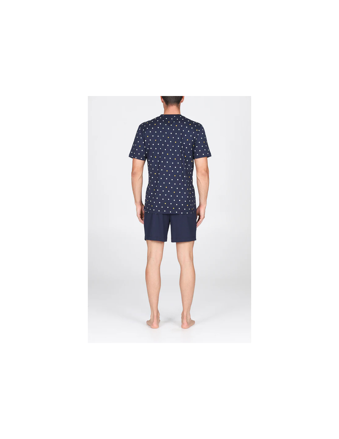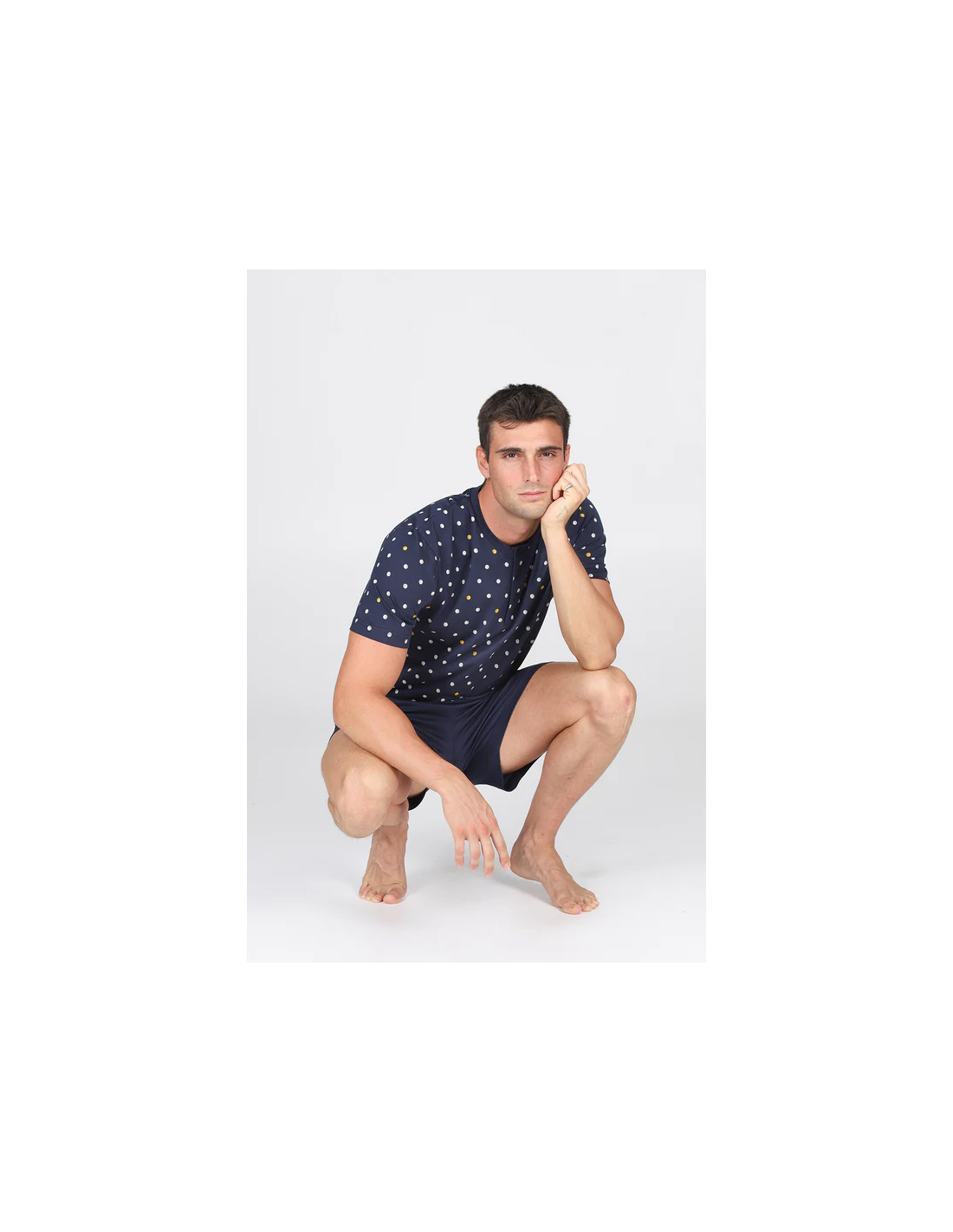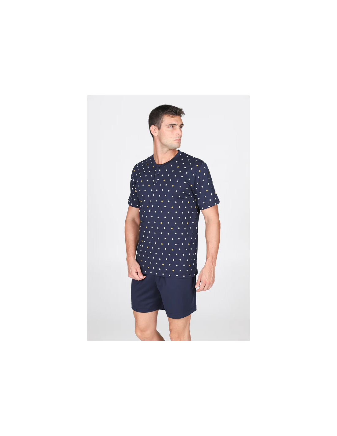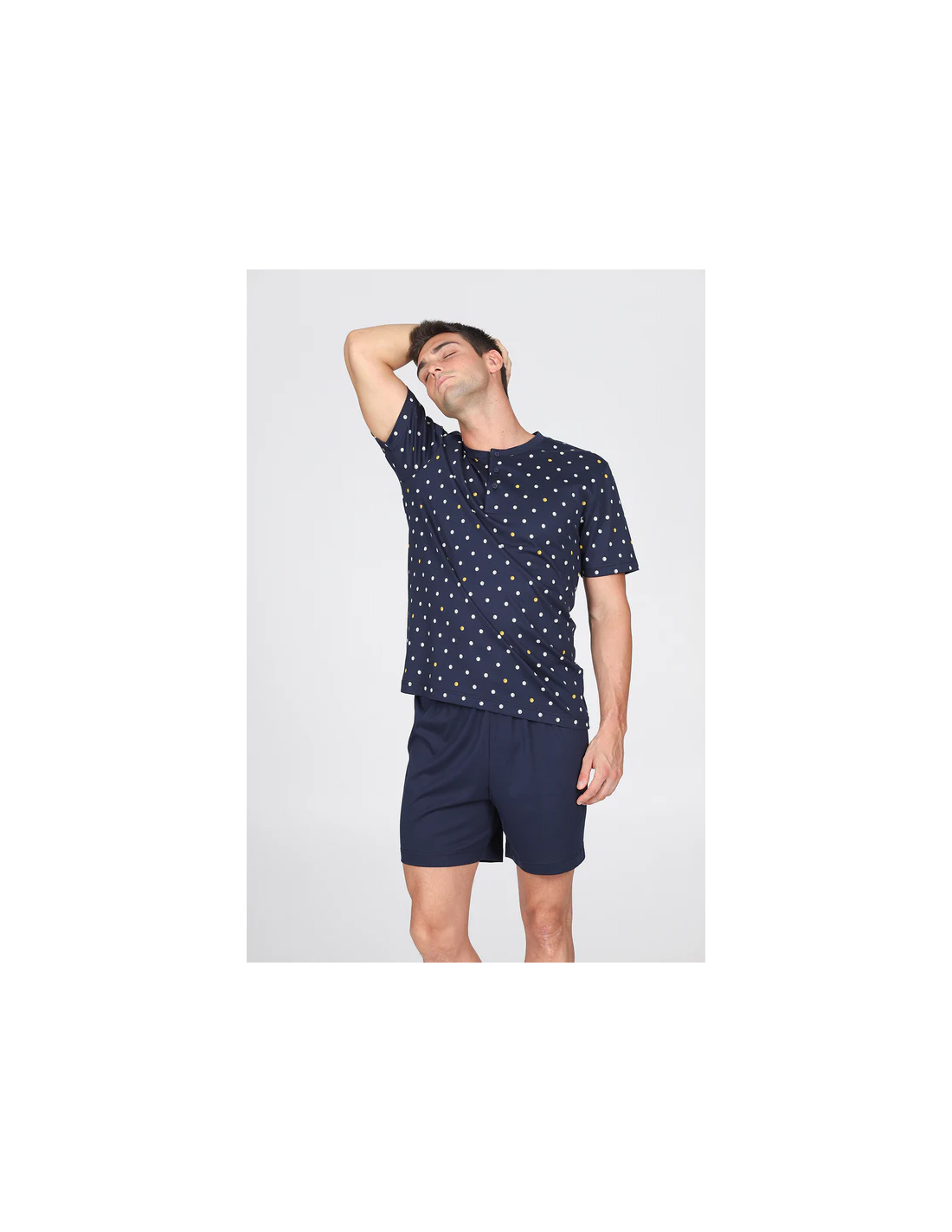 Pigiama corto uomo, in fresco jersey 80/2 di puro cotone gasato, doppio ritorto: estremamente leggero consistente e morbido. Particolarmente adatto a soddisfare la richiesta di qualità del consumatore più esigente. Maglia con collo a serafino in fantasia "Palline tennis", pantaloncini in tinta unita blu.