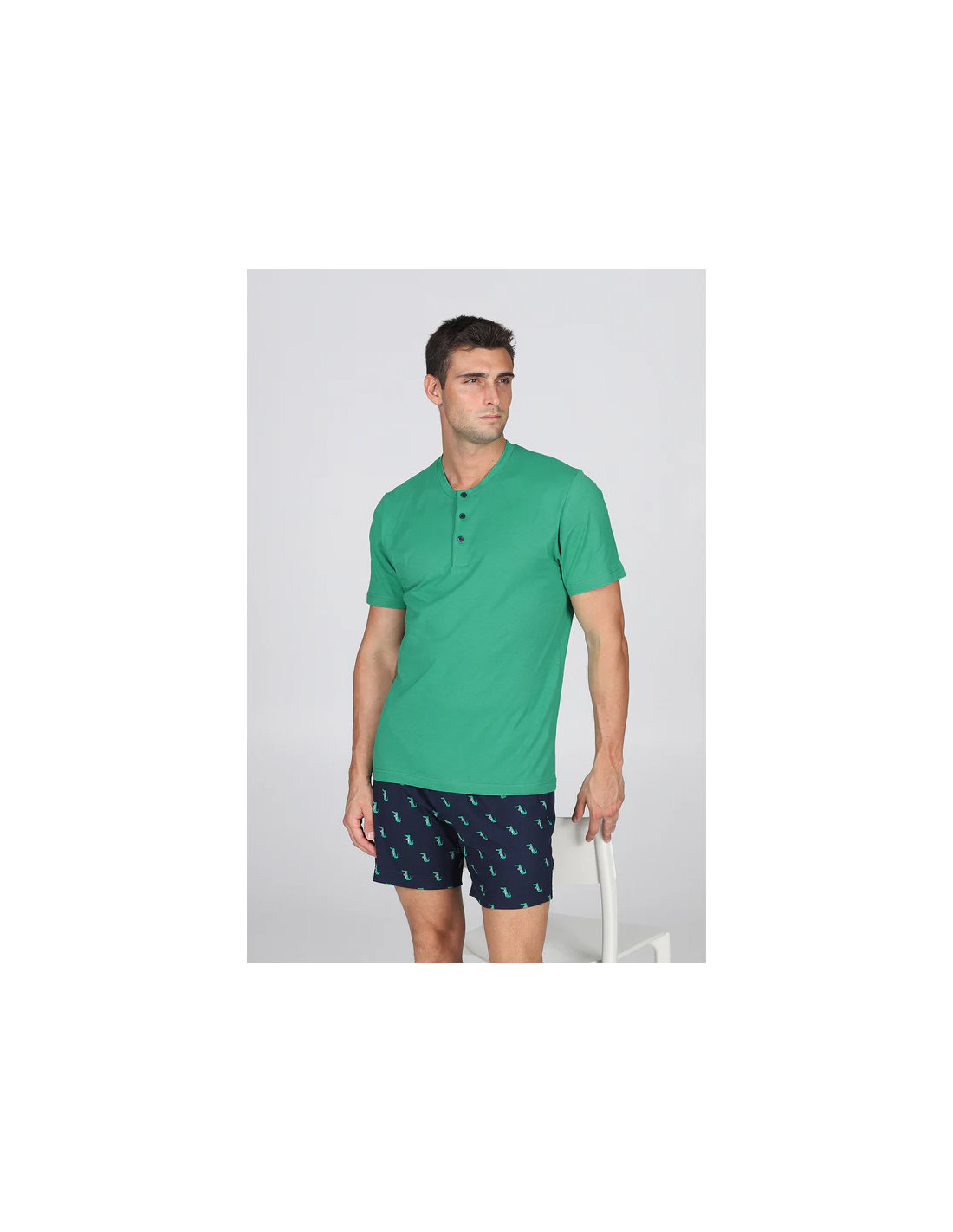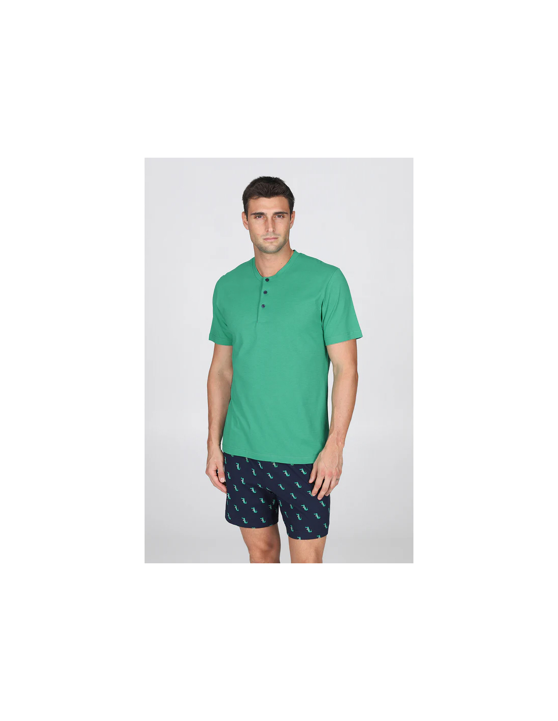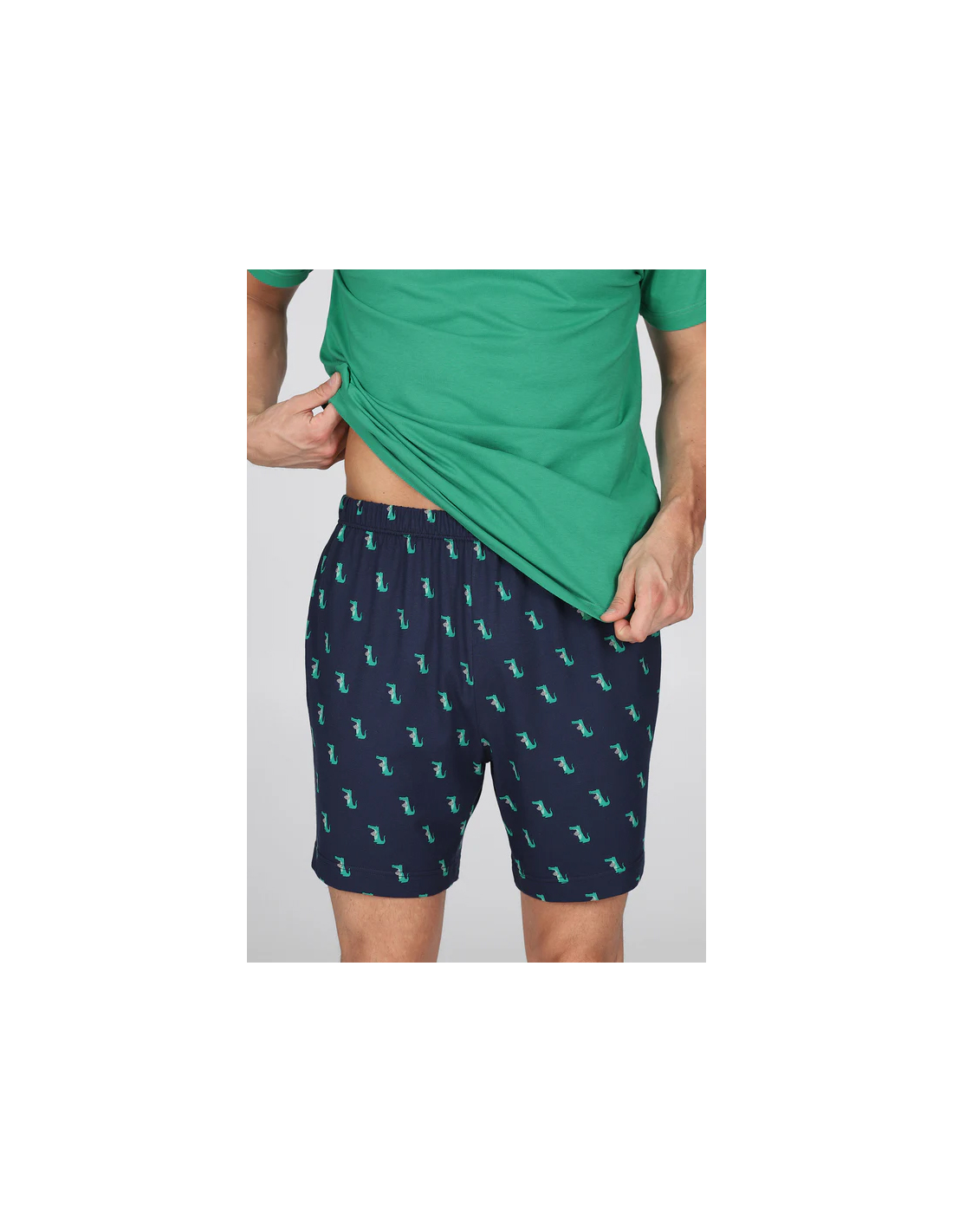 Pigiama corto in esclusivo jersey 36/1 di puro cotone, la cui particolare torsione del filato garantisce una straordinaria traspirabilità e freschezza. Tessuto leggero, fluido, anti torsione . Maglia con collo a serafino in brillante tinta unita verde. Pantaloncini con stampa fantasia " Coccodrillo". Adatto alle stagioni più calde.