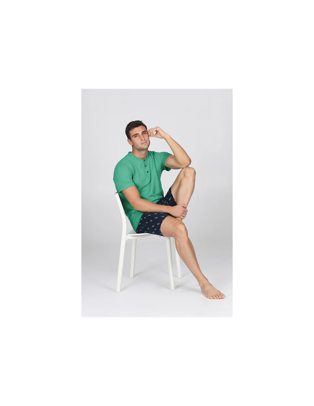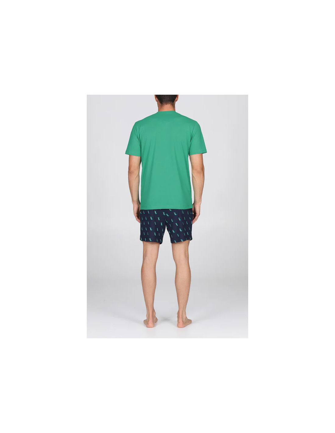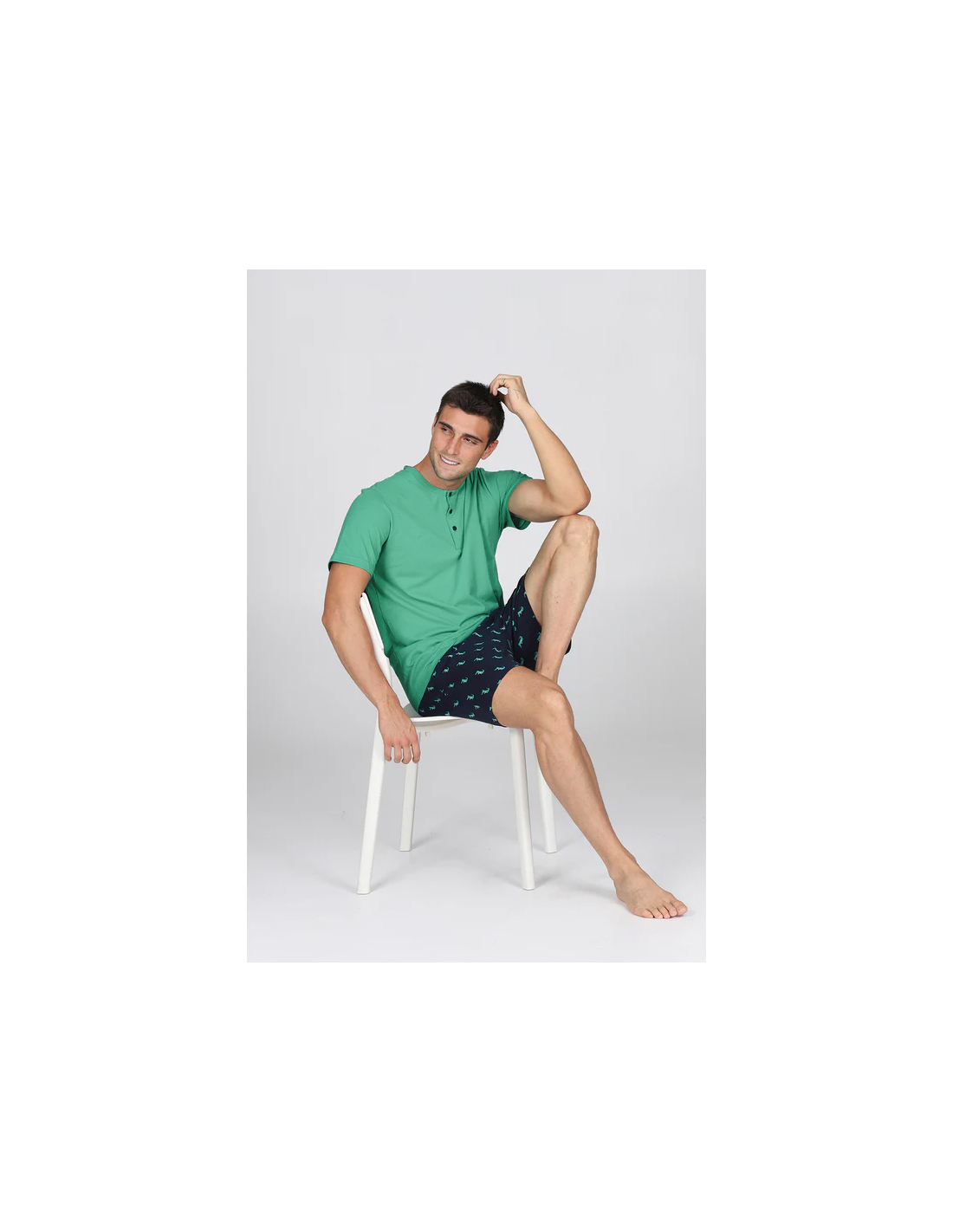 Pigiama corto in esclusivo jersey 36/1 di puro cotone, la cui particolare torsione del filato garantisce una straordinaria traspirabilità e freschezza. Tessuto leggero, fluido, anti torsione . Maglia con collo a serafino in brillante tinta unita verde. Pantaloncini con stampa fantasia " Coccodrillo". Adatto alle stagioni più calde.