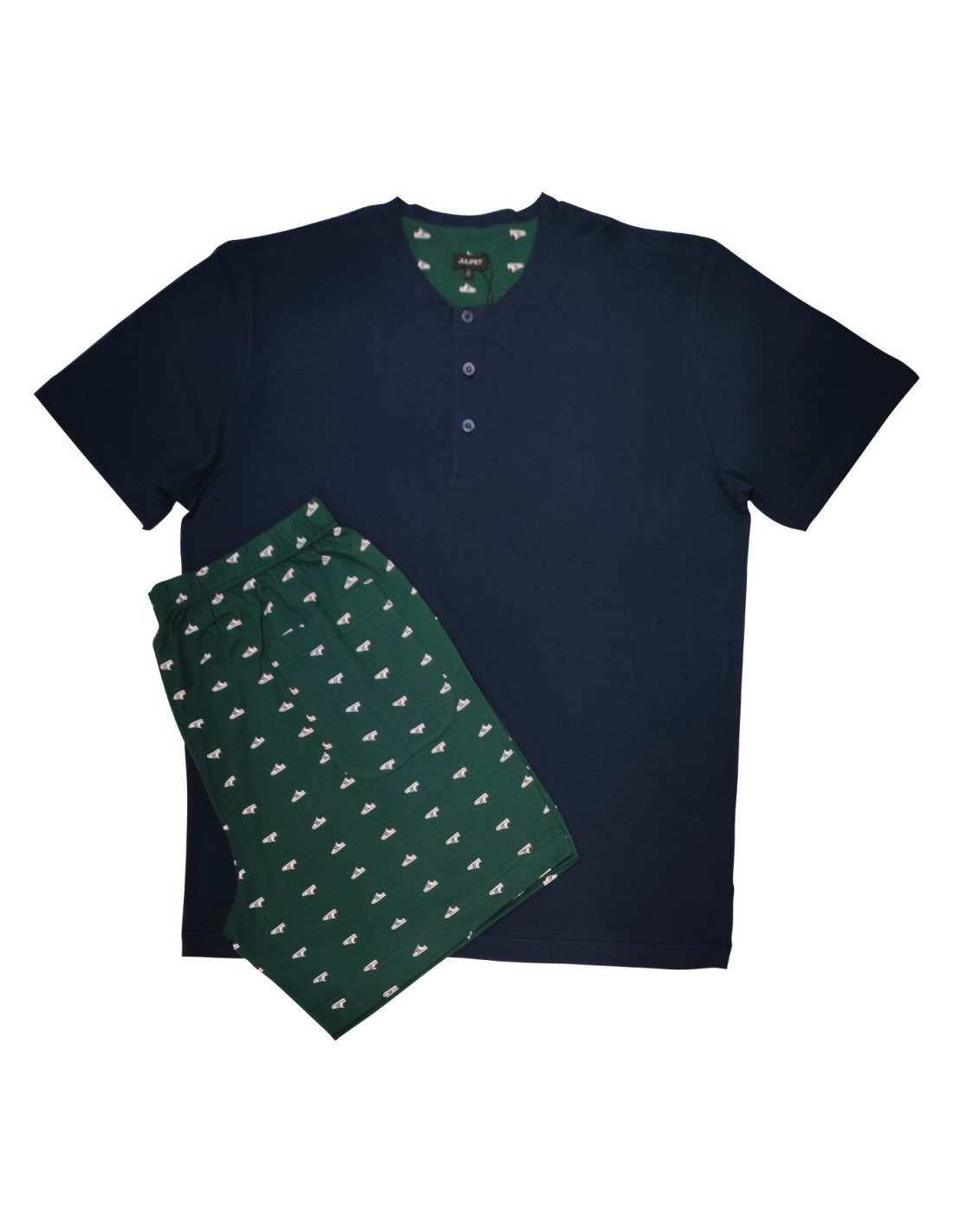 Pigiama corto in esclusivo jersey 36/1 di puro cotone, la cui particolare torsione del filato garantisce una straordinaria traspirabilità e freschezza. Tessuto leggero, fluido, anti torsione . Maglia in tinta unita blu con collo a serafino e pantaloncini in fantasia "sneakers". Adatto alle stagioni più calde.