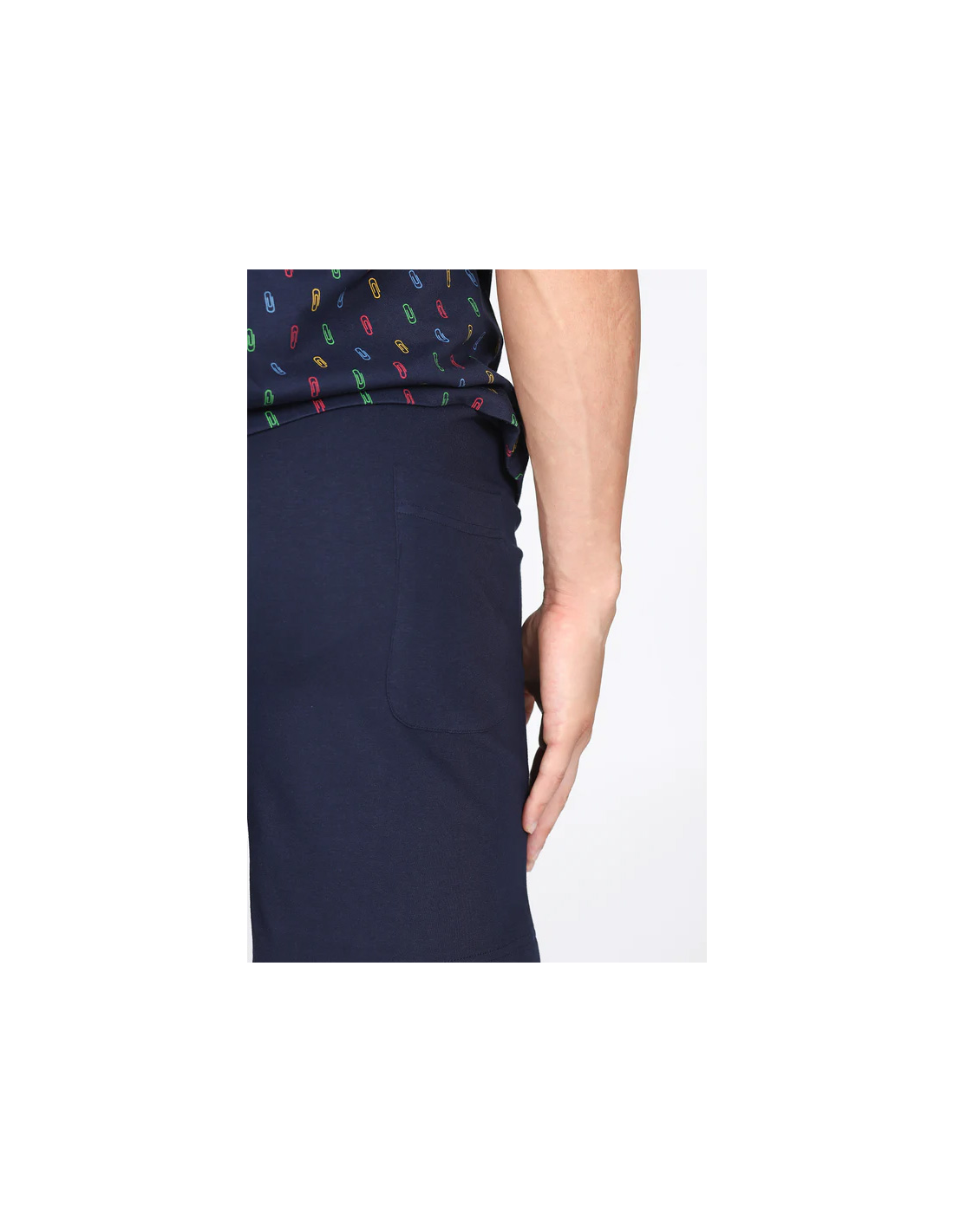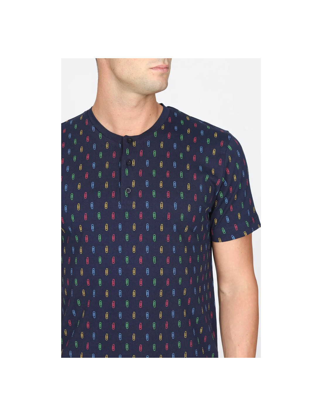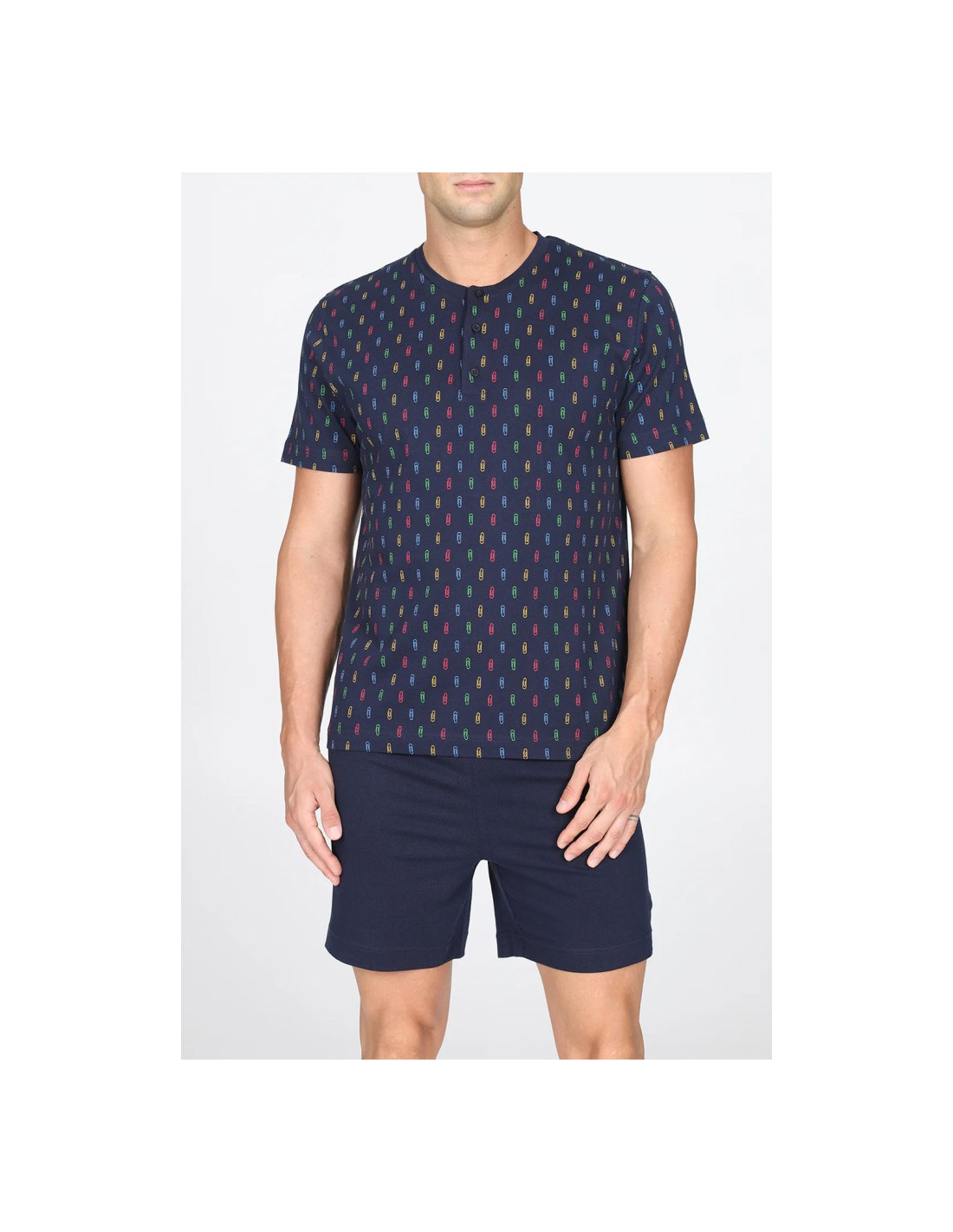 Pigiama corto maglia serafino con disegni fantasia "graffette". Pantalone corto in tinta unita blu con polsini. In esclusivo jersey 36/1 di puro cotone s/z estremamente leggero, fluido e traspirante. Adatto alle stagioni più calde. Il filato presenta una doppia torsione denominata s/Zeta, che garantisce una straordinaria traspirabilità e freschezza. Oltre a evitare la torsione delle cuciture ai lavaggi.