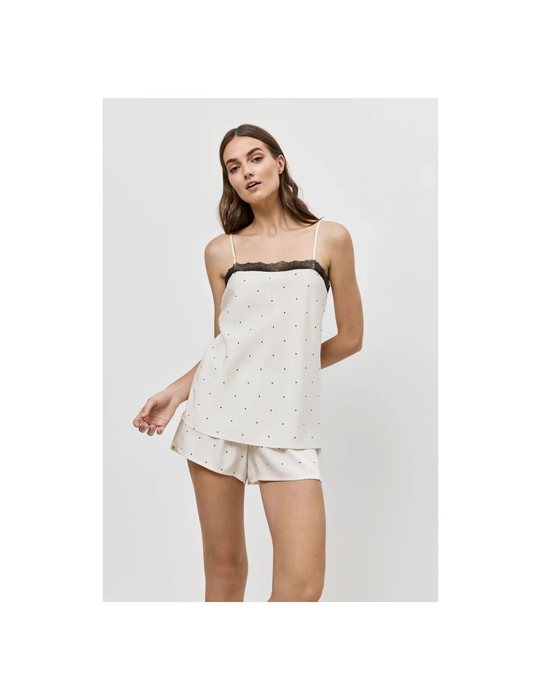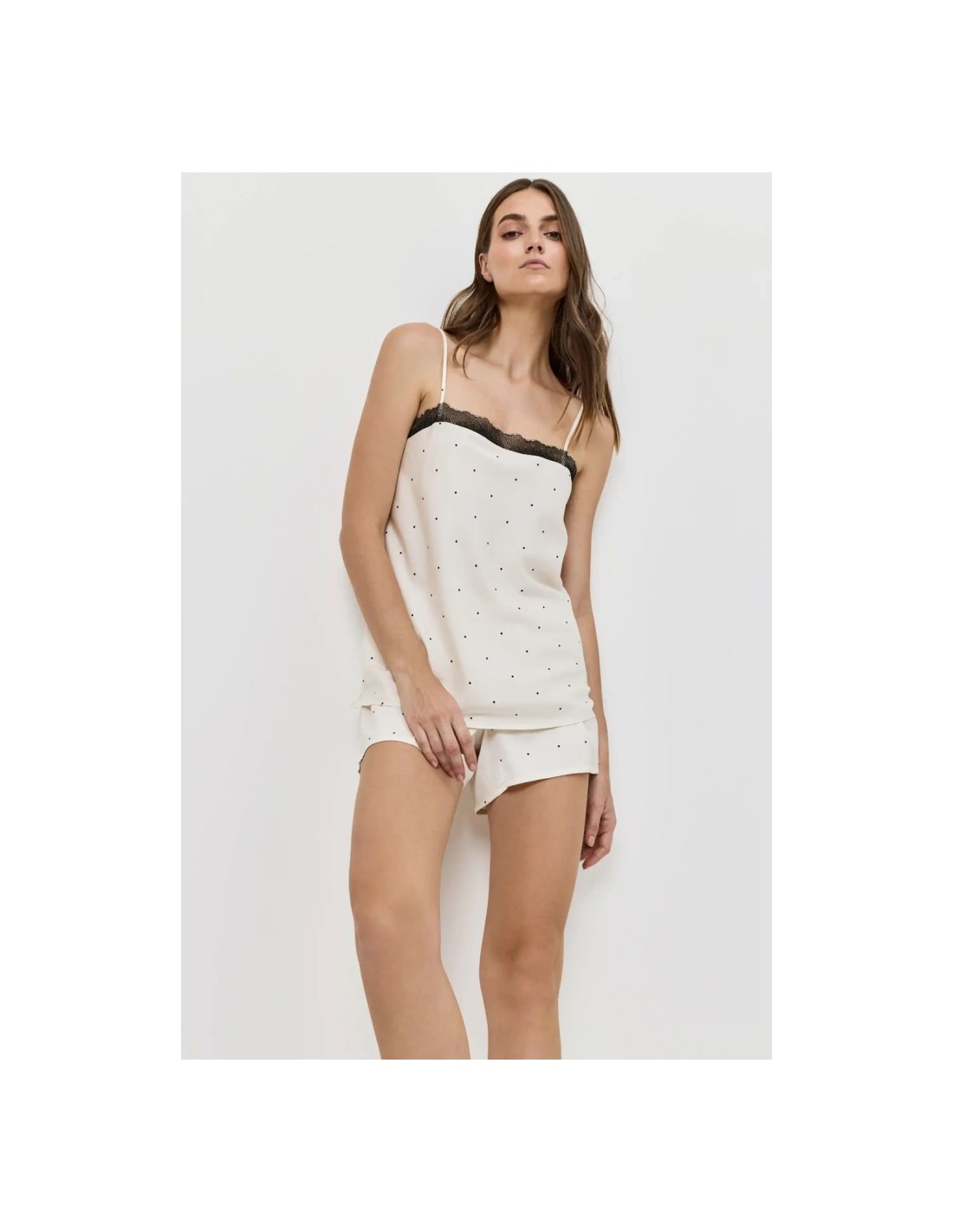 composto da un top con spalline sottili e finiture in pizzo e da pantaloncini