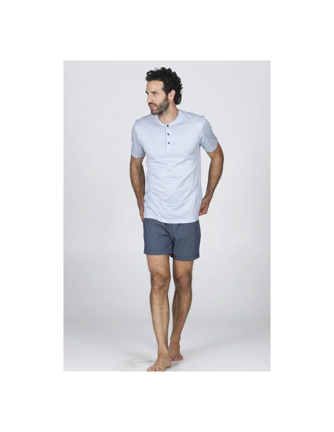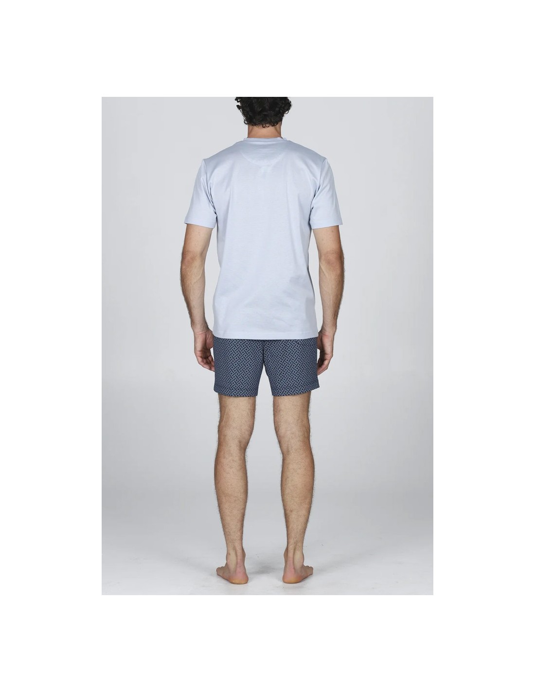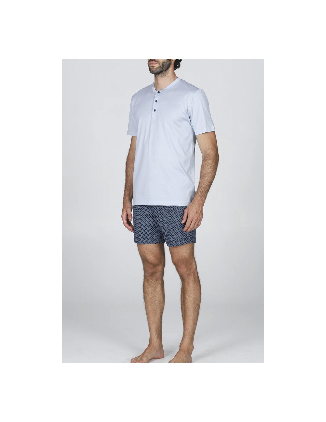 Eleva i tuoi momenti di relax con questo pigiama corto da uomo, un capo che combina l'eccellenza sartoriale con un design moderno e vivace. Realizzato in pregiato Jersey 60/2 di cotone doppio ritorto e mercerizzato, offre una brillantezza naturale e una mano setosa che ridefiniscono il concetto di abbigliamento da notte.