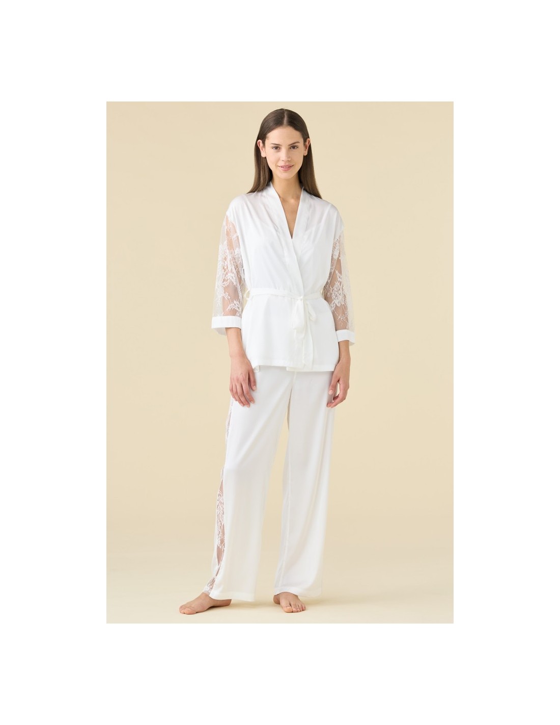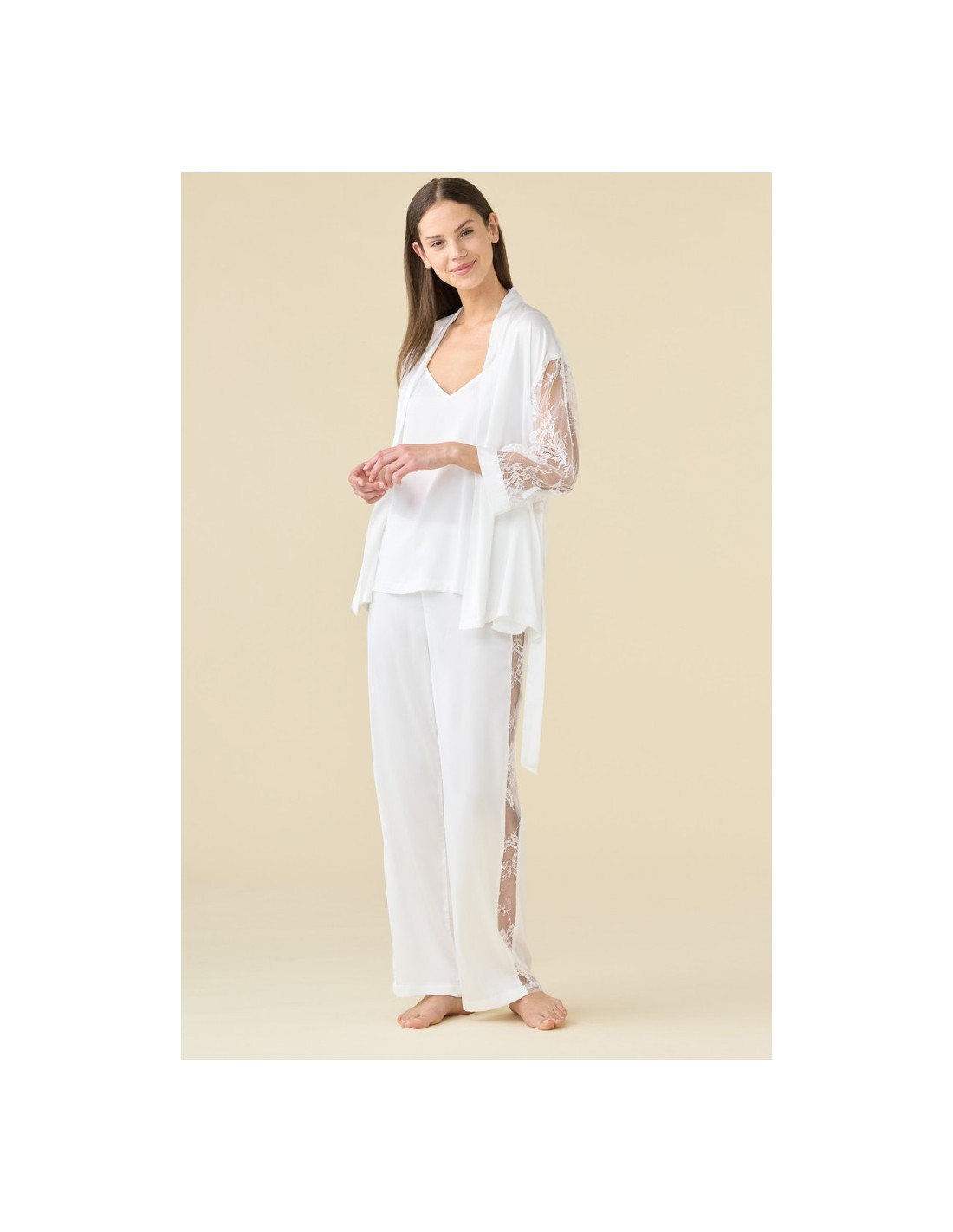 con maniche in pizzo e fusciacca in vita. Pantalone lungo con dettagli in