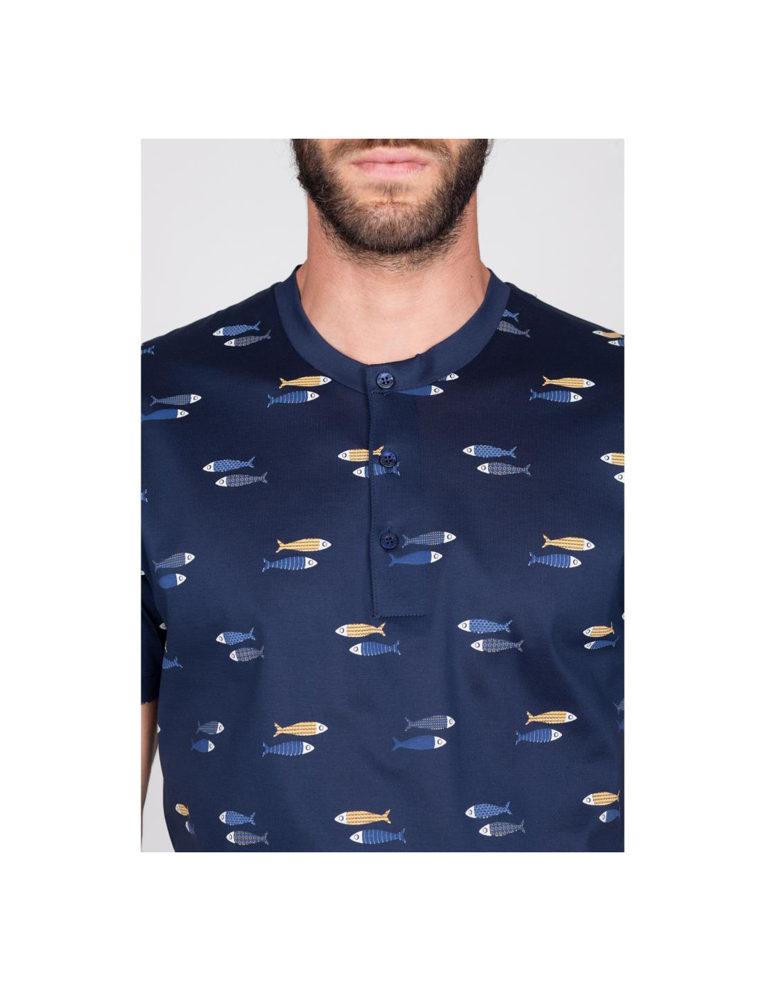 Maglia collo a serafino 3 bottoni, fantasia " Pesci " e maniche corte.