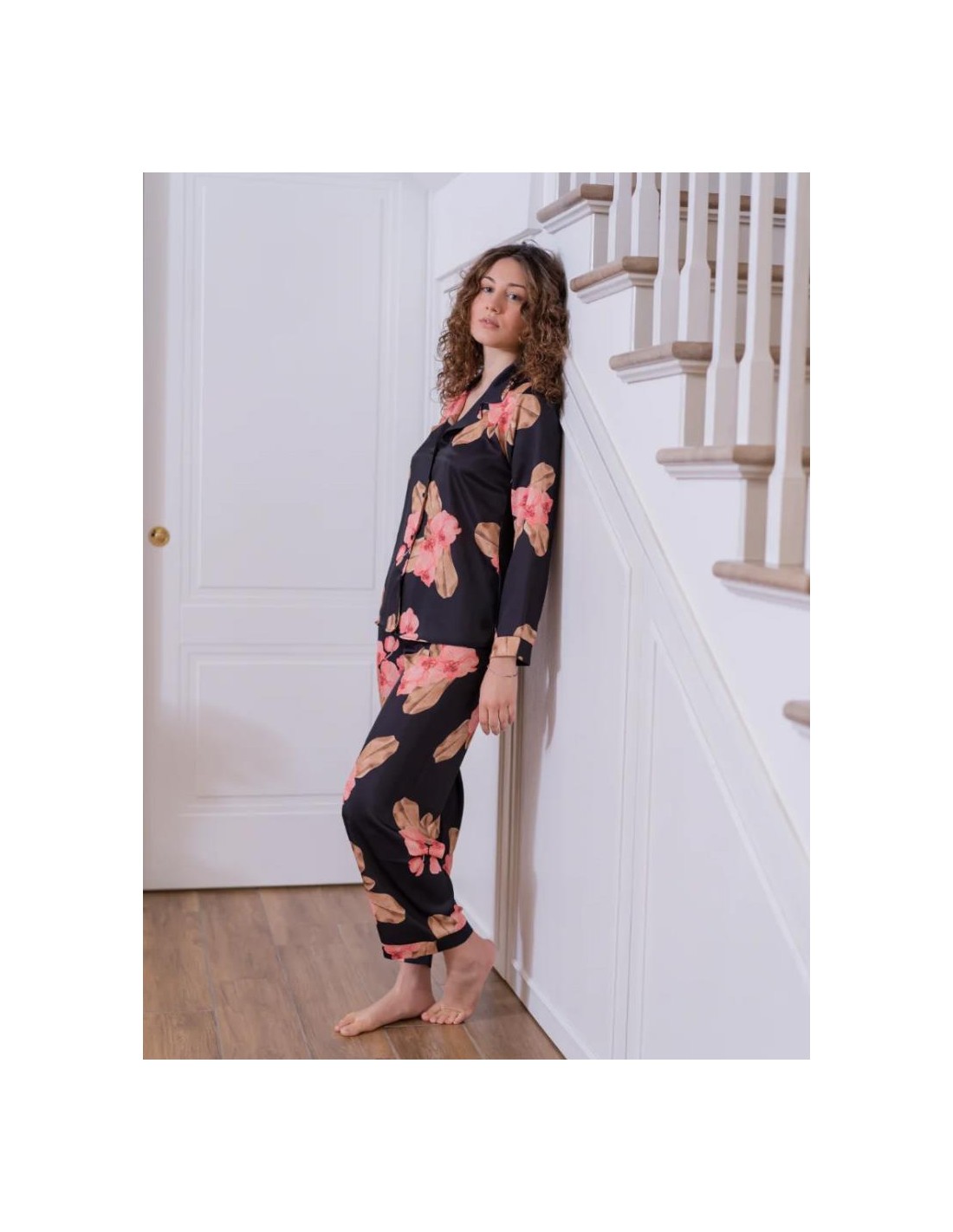 FILO D'ANGELO PIGIAMA DONNA APERTO MANICA LUNGA E PANTALONE LUNGO - FIORE NERO