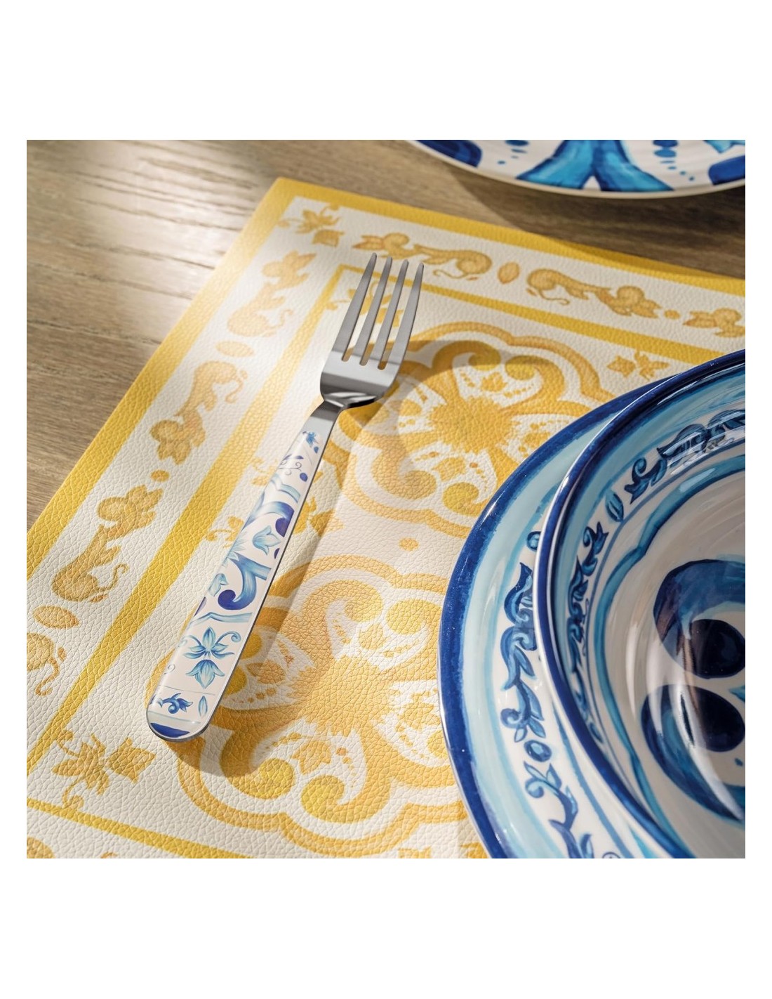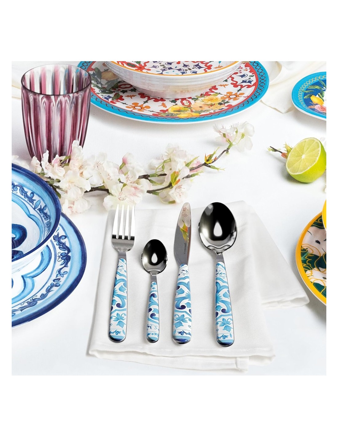 Le posate in acciaio con manico in plastica decorata ‘’Blues’’ aggiungono un tocco di colore e allegria alla tavola.