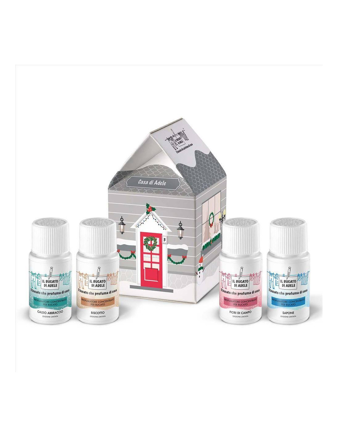 La Casa di Natale contiene 4 flaconi di Profumo Bucato concentrato nelle 4 esclusive fragranze natalizie in un'unica dose da 20ml: