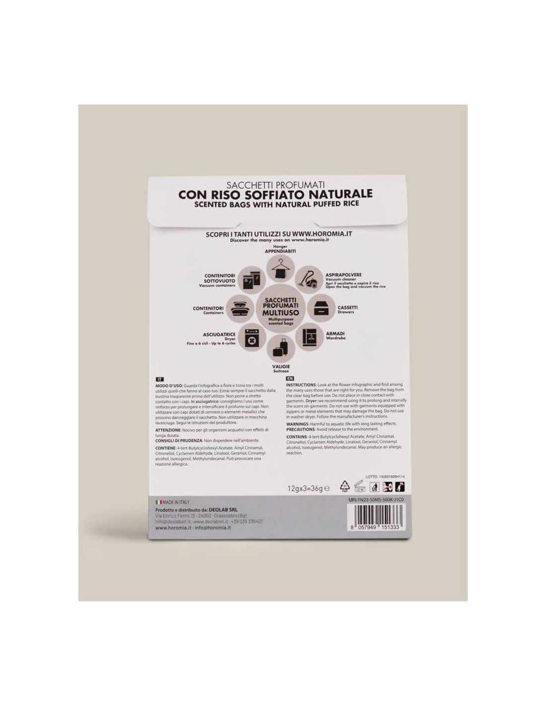 L’unicità e l’intensità delle fragranze Horomia ora in Sacchetti Profumati Multiuso. Creati con riso soffiato naturale non alimentare, i sacchetti profumati Horomia sono formulati per donare ai tuoi capi e alla tua casa il profumo unico e inconfondibile della tua fragranza preferita. Ogni confezione contiene tre sacchetti profumati avvolti in una busta trasparente ad alta protezione, per un profumo intenso e duraturo fino a 12 settimane.