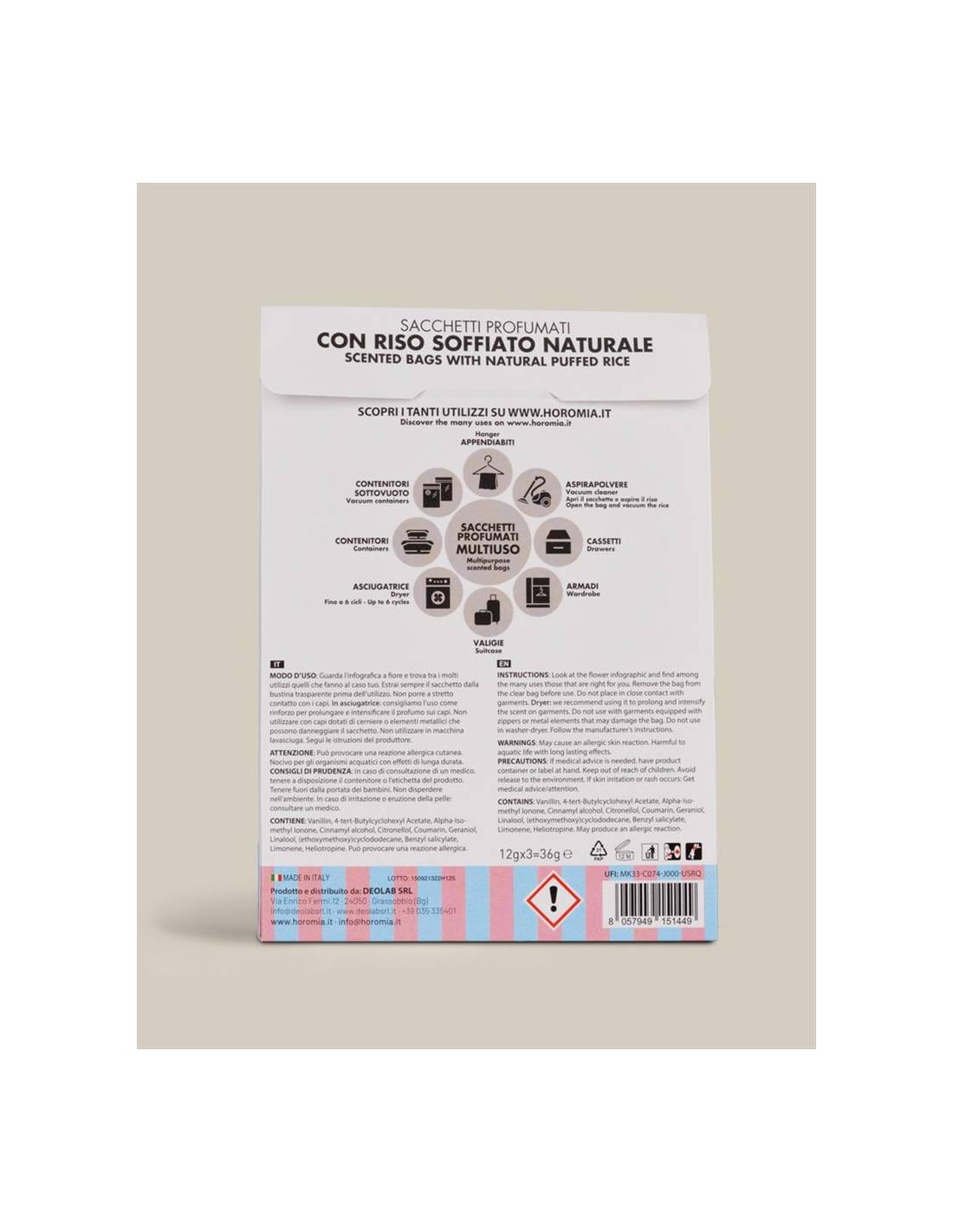 L’unicità e l’intensità delle fragranze Horomia ora in Sacchetti Profumati Multiuso. Creati con riso soffiato naturale non alimentare, i sacchetti profumati Horomia sono formulati per donare ai tuoi capi e alla tua casa il profumo unico e inconfondibile della tua fragranza preferita. Ogni confezione contiene tre sacchetti profumati avvolti in una busta trasparente ad alta protezione, per un profumo intenso e duraturo fino a 12 settimane.