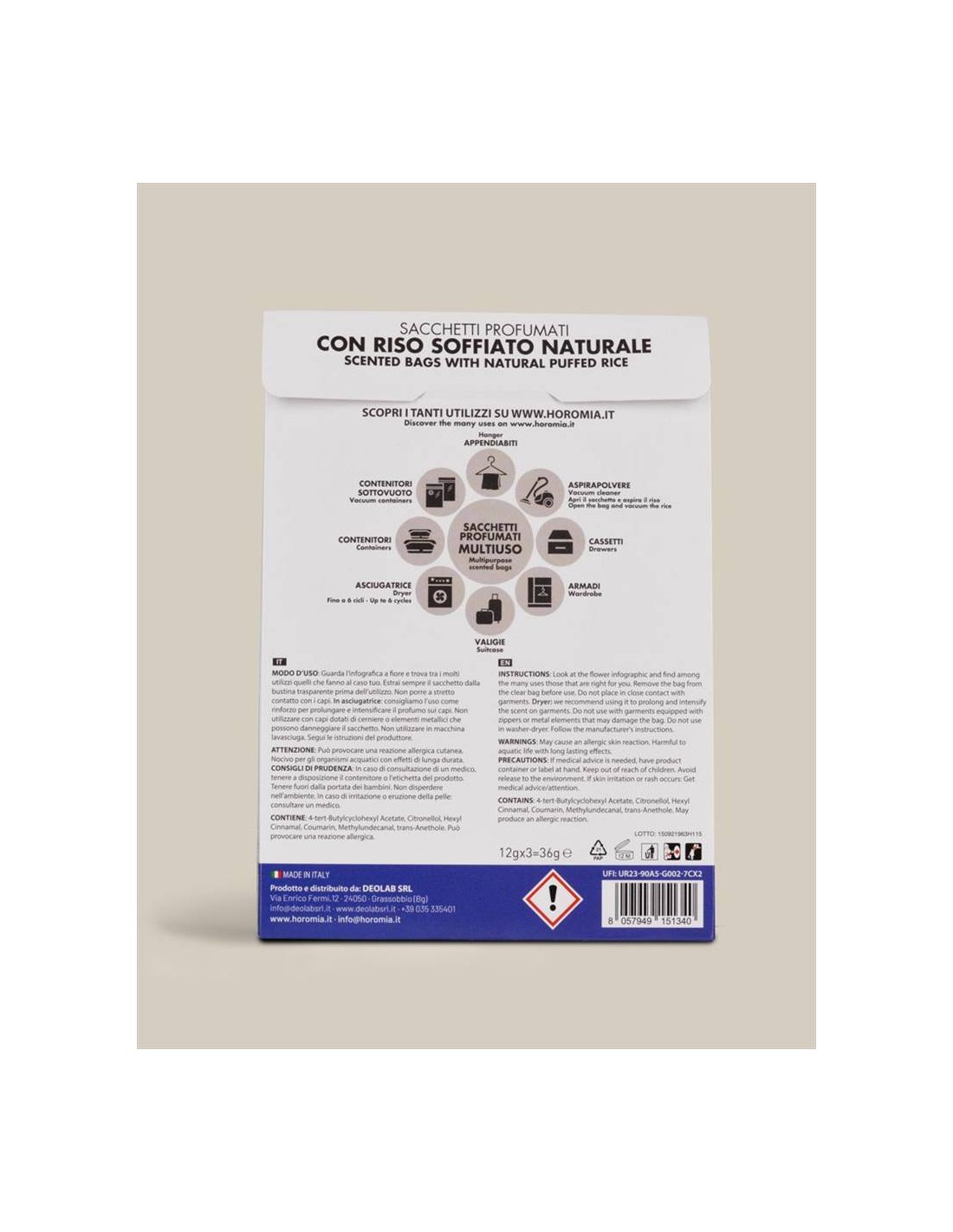 L’unicità e l’intensità delle fragranze Horomia ora in Sacchetti Profumati Multiuso. Creati con riso soffiato naturale non alimentare, i sacchetti profumati Horomia sono formulati per donare ai tuoi capi e alla tua casa il profumo unico e inconfondibile della tua fragranza preferita. Ogni confezione contiene tre sacchetti profumati avvolti in una busta trasparente ad alta protezione, per un profumo intenso e duraturo fino a 12 settimane.