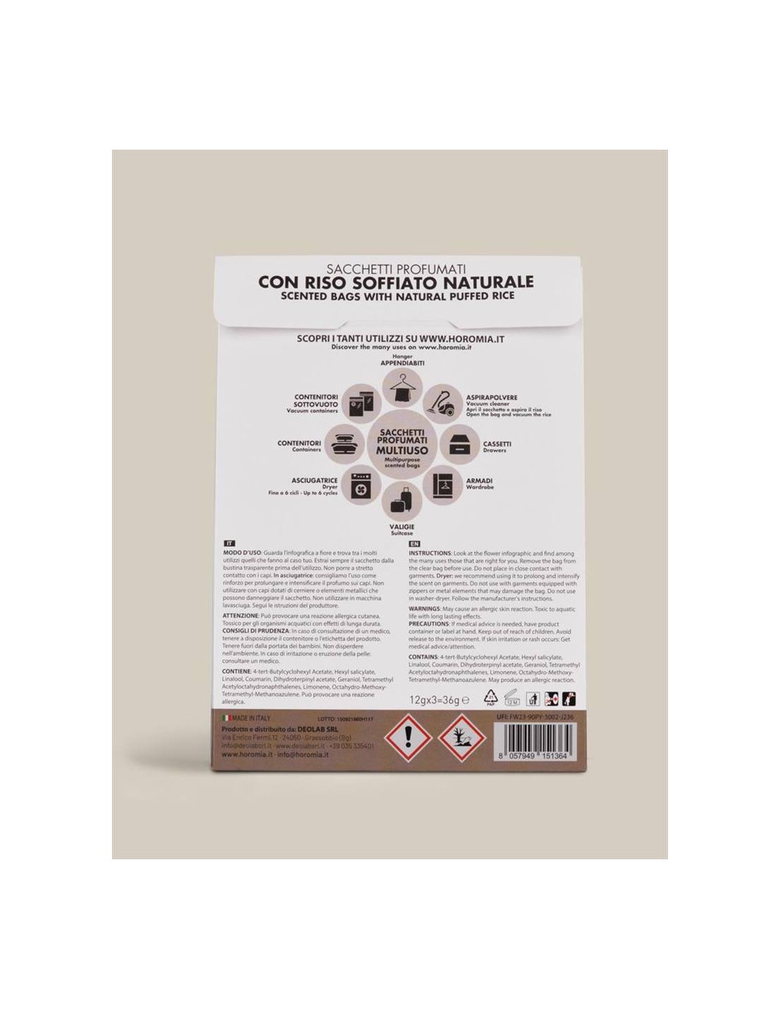 L’unicità e l’intensità delle fragranze Horomia ora in Sacchetti Profumati Multiuso. Creati con riso soffiato naturale non alimentare, i sacchetti profumati Horomia sono formulati per donare ai tuoi capi e alla tua casa il profumo unico e inconfondibile della tua fragranza preferita. Ogni confezione contiene tre sacchetti profumati avvolti in una busta trasparente ad alta protezione, per un profumo intenso e duraturo fino a 12 settimane.