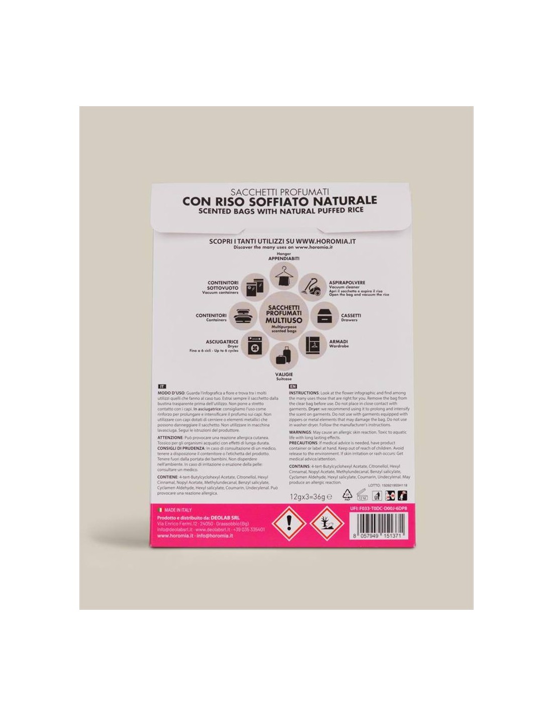 L’unicità e l’intensità delle fragranze Horomia ora in Sacchetti Profumati Multiuso. Creati con riso soffiato naturale non alimentare, i sacchetti profumati Horomia sono formulati per donare ai tuoi capi e alla tua casa il profumo unico e inconfondibile della tua fragranza preferita. Ogni confezione contiene tre sacchetti profumati avvolti in una busta trasparente ad alta protezione, per un profumo intenso e duraturo fino a 12 settimane.