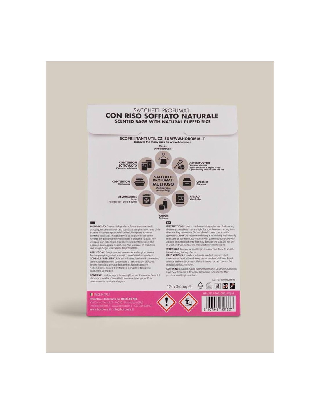 L’unicità e l’intensità delle fragranze Horomia ora in Sacchetti Profumati Multiuso. Creati con riso soffiato naturale non alimentare, i sacchetti profumati Horomia sono formulati per donare ai tuoi capi e alla tua casa il profumo unico e inconfondibile della tua fragranza preferita. Ogni confezione contiene tre sacchetti profumati avvolti in una busta trasparente ad alta protezione, per un profumo intenso e duraturo fino a 12 settimane.