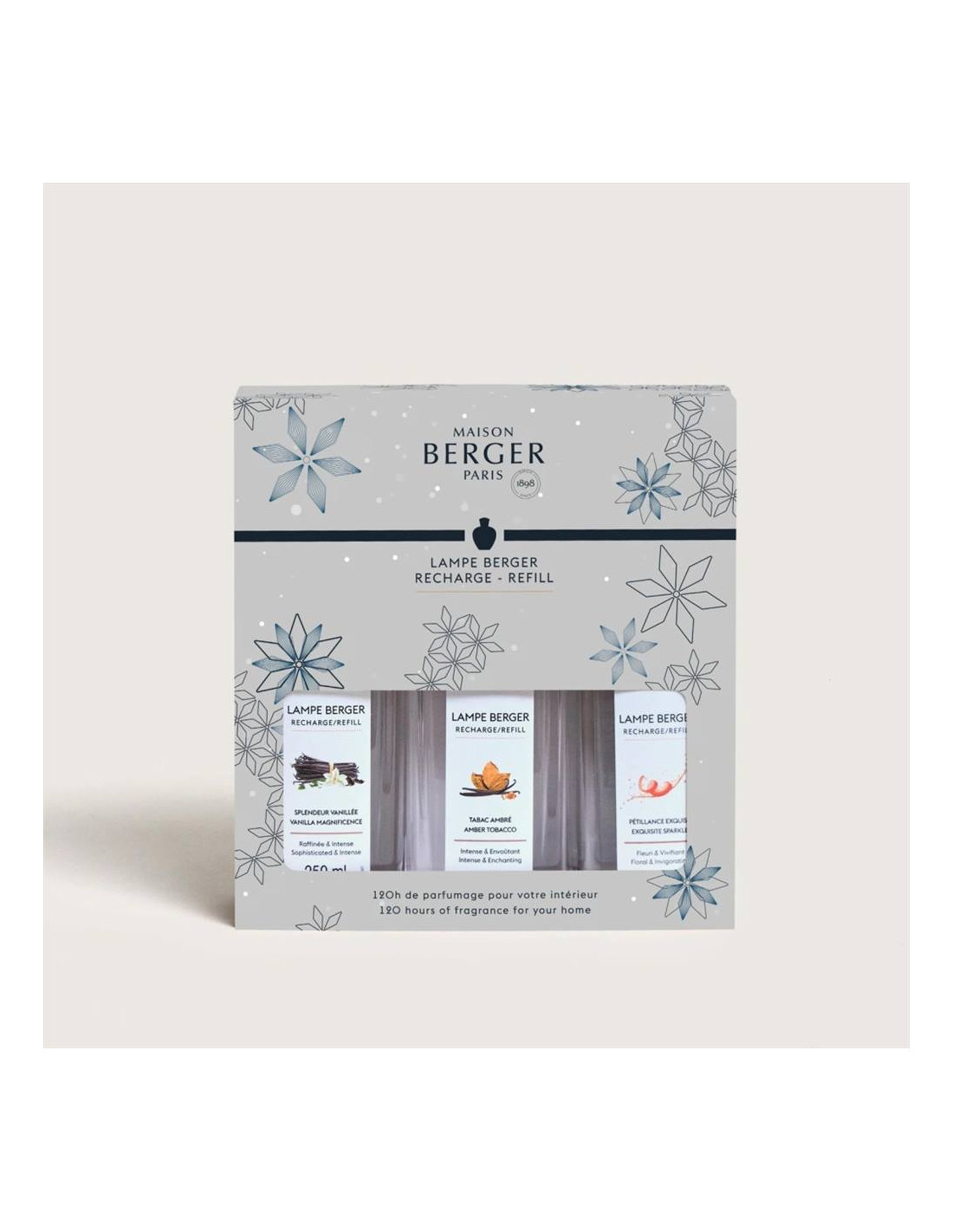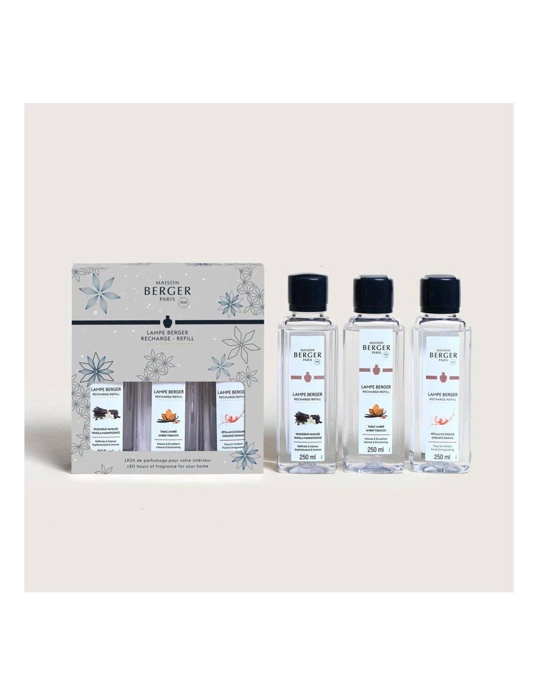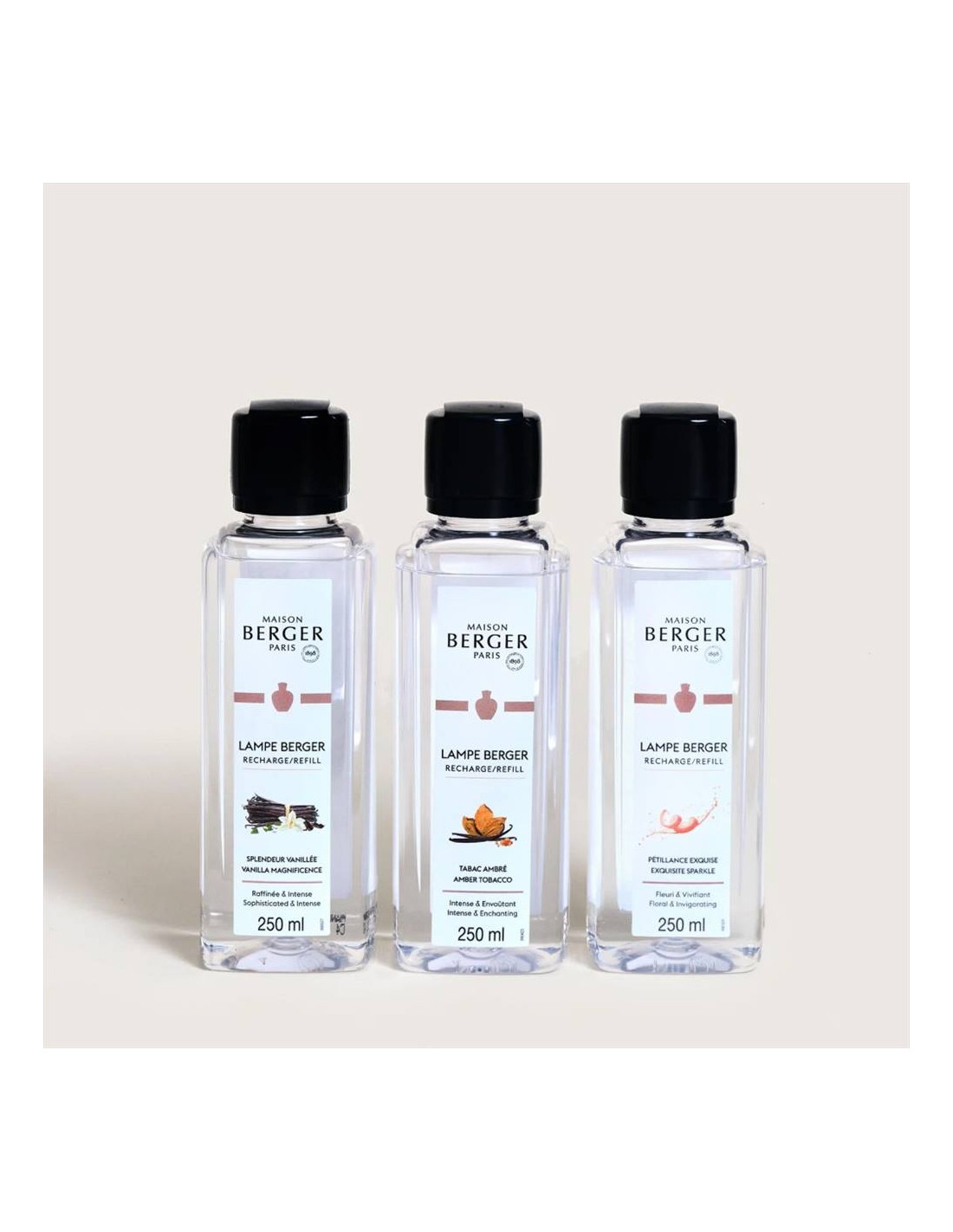 La confezione da 3 ricariche Lampe Berger da 250 ml è così formata: