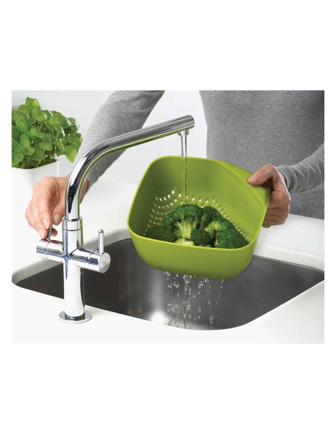 Questo scolapasta quadrato elegante e funzionale rende ancora più facile drenare il cibo grazie alla sua forma ergonomica unica e al manico verticale che lo mantiene in posizione verticale e stabile quando viene appoggiato.