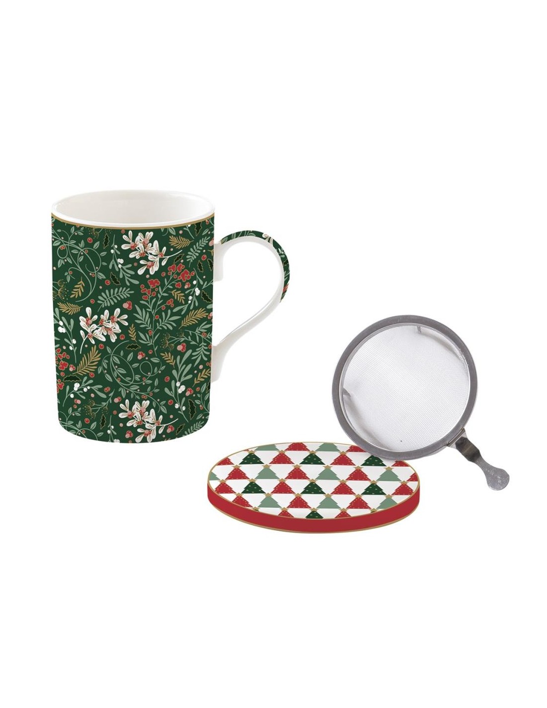 TAZZA MUG CON SOTTOTAZZA IN PORCELLANA DECORATA E FILTRO IN ACCIAIO