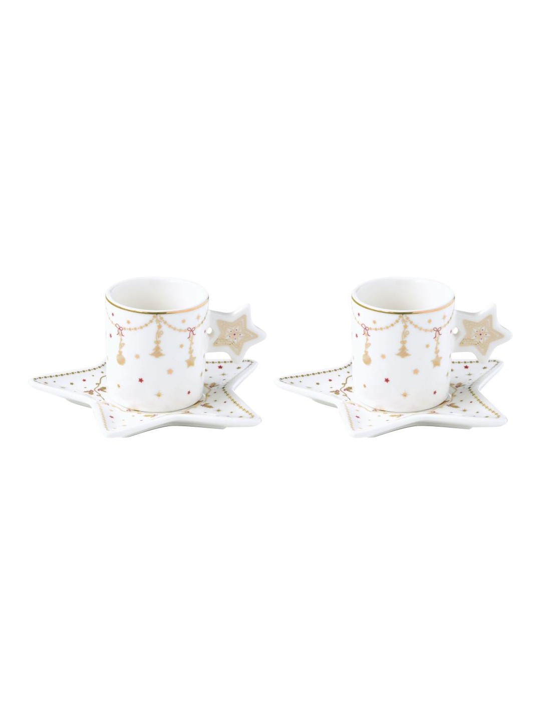Set 2 tazzine caffè con piattino coordinato in porcellana bianca e docori in filo oro natalizi.