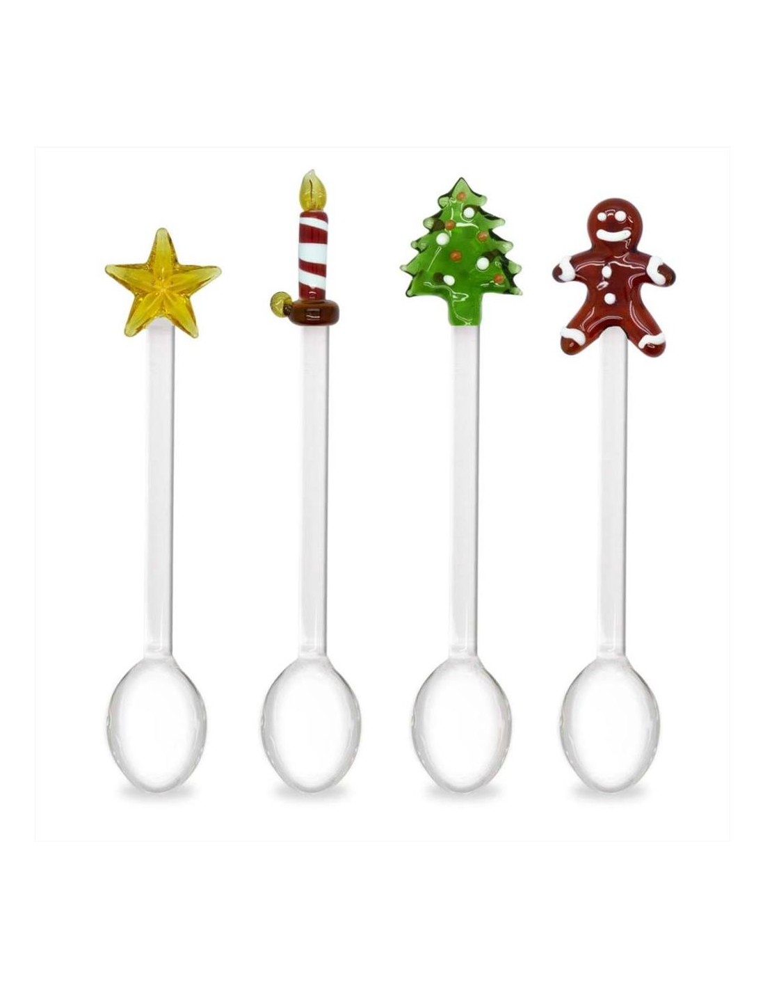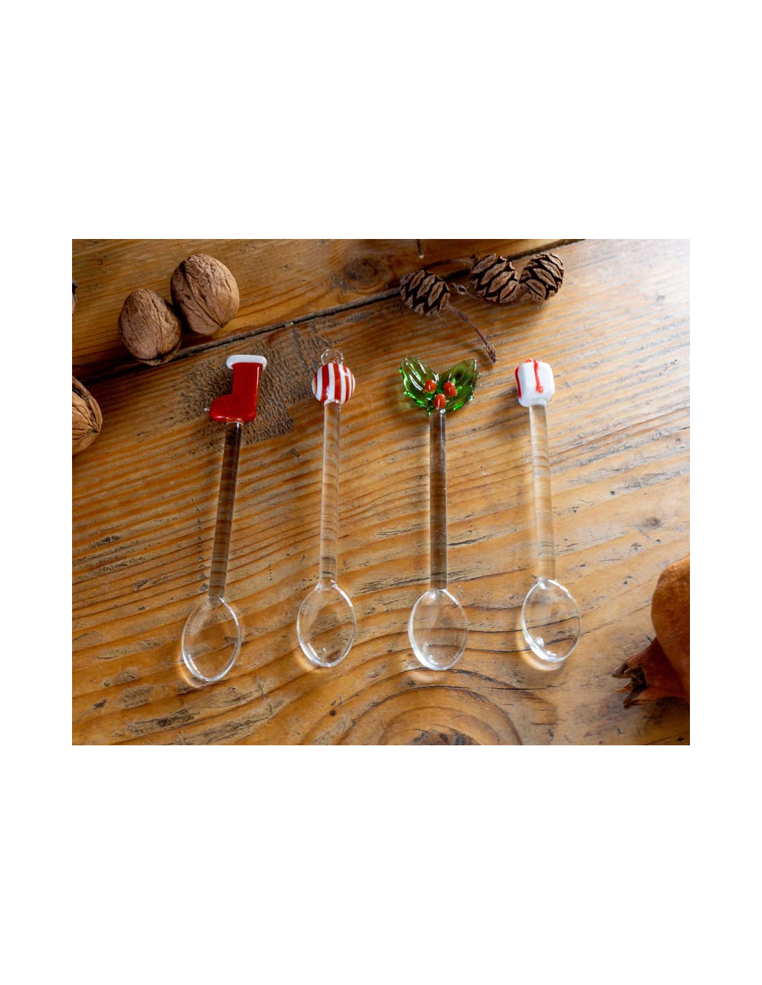 Set 4 cucchiaini da caffè con decoro natalizio realizzato artigianalmente in vetro soffiato colorato.