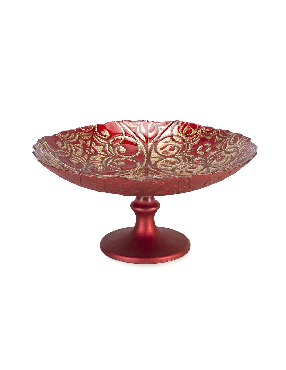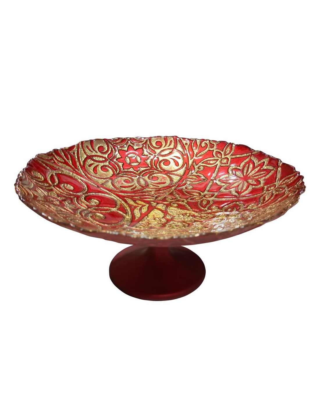 Alzata in vetro rosso con arabeschi oro.