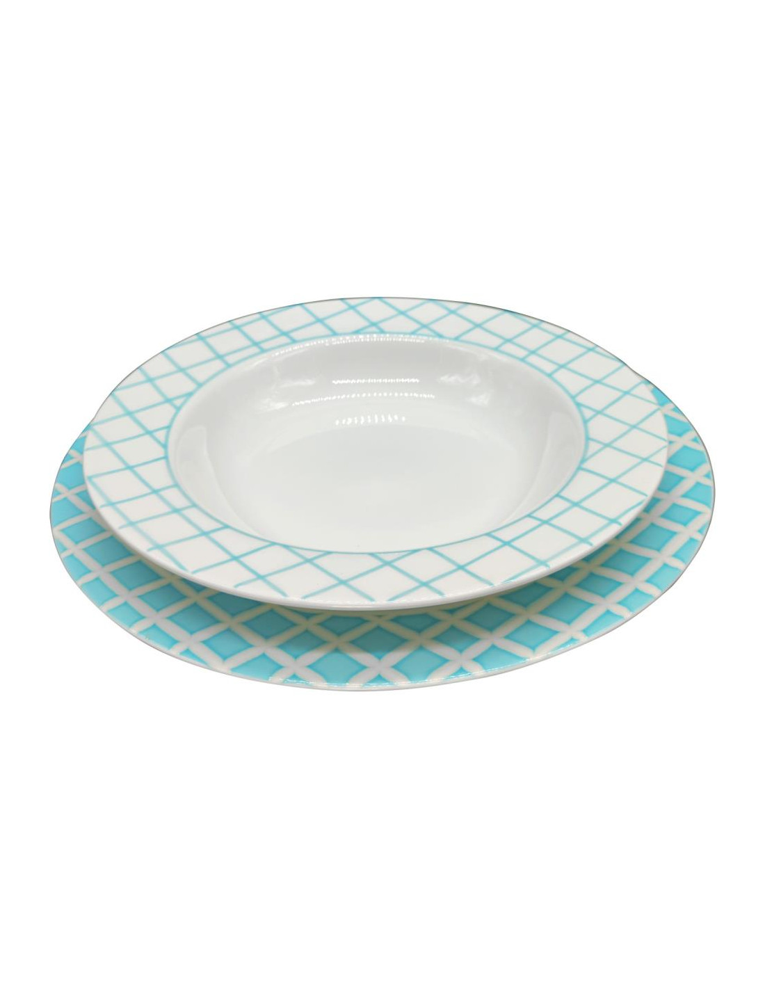 Servizio piatti giornaliero in porcellana New Bone China, con bordi decorati incisi.