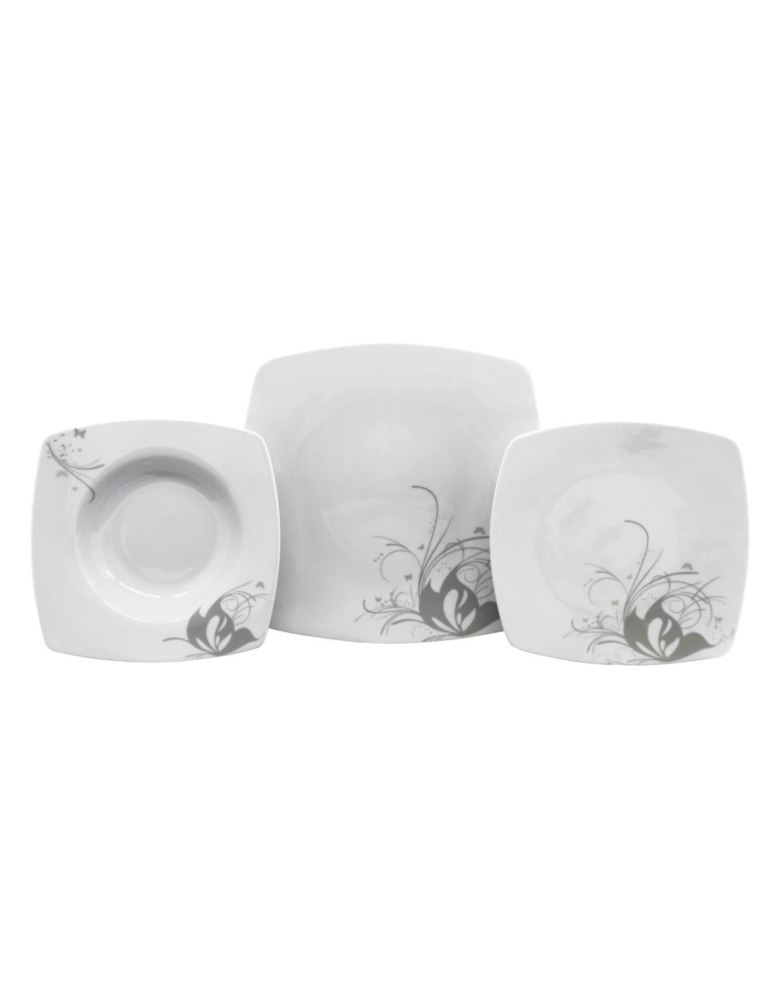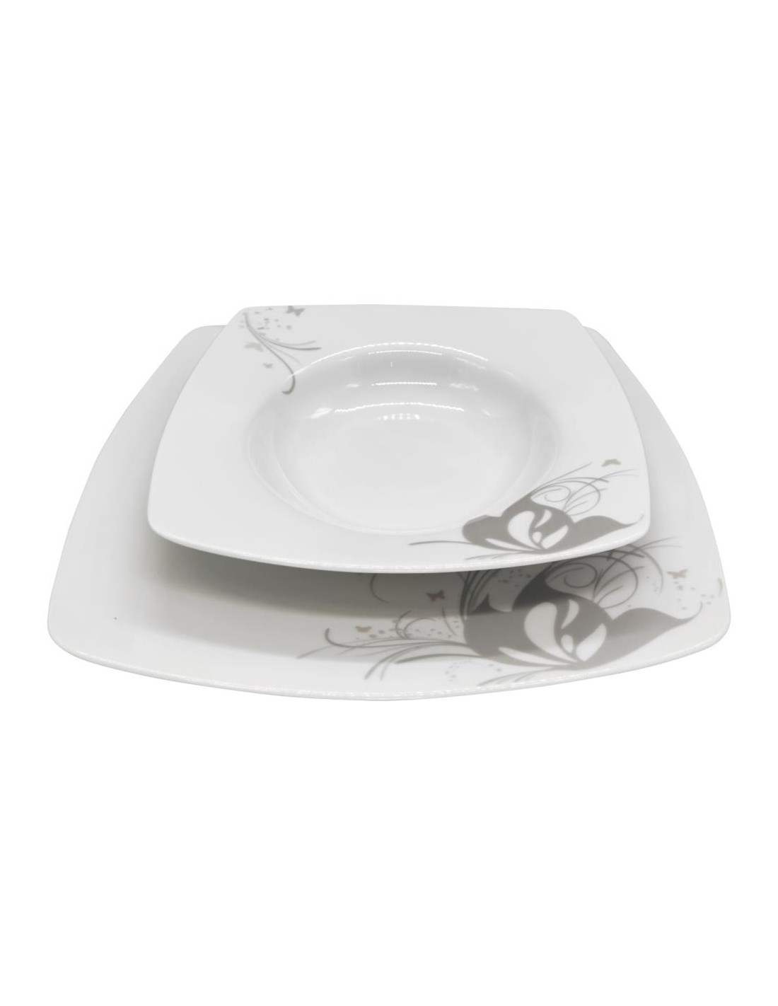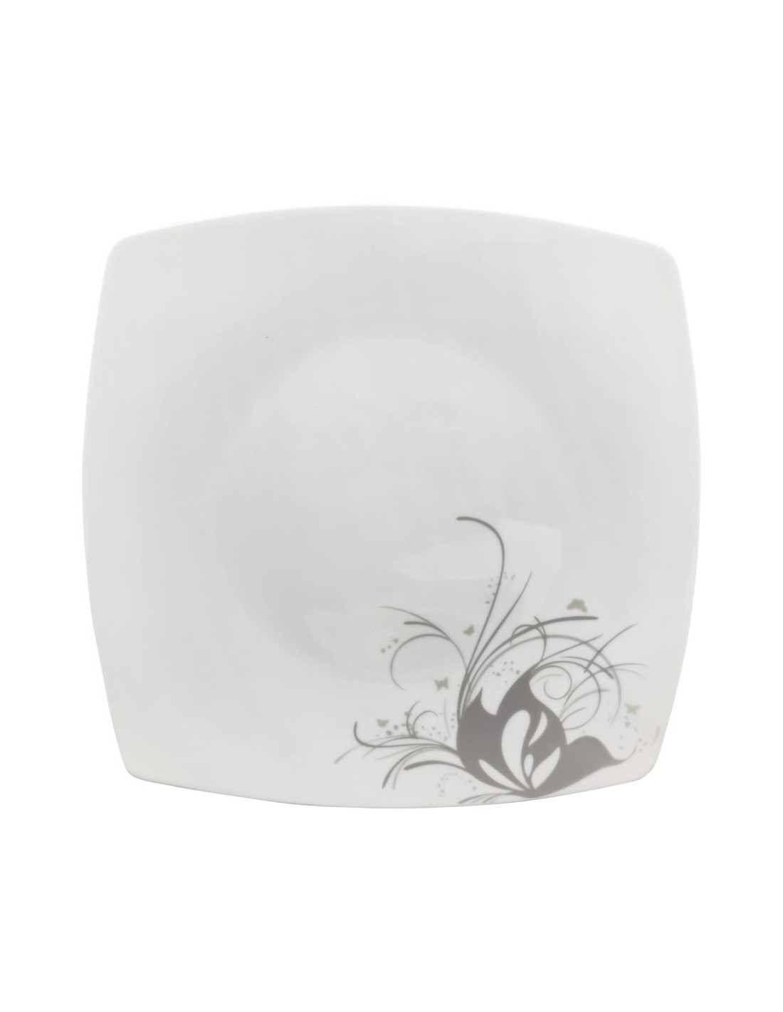Servizio piatti quadrato elegante in porcellana decorata da un fiore stilizzato e farfalle