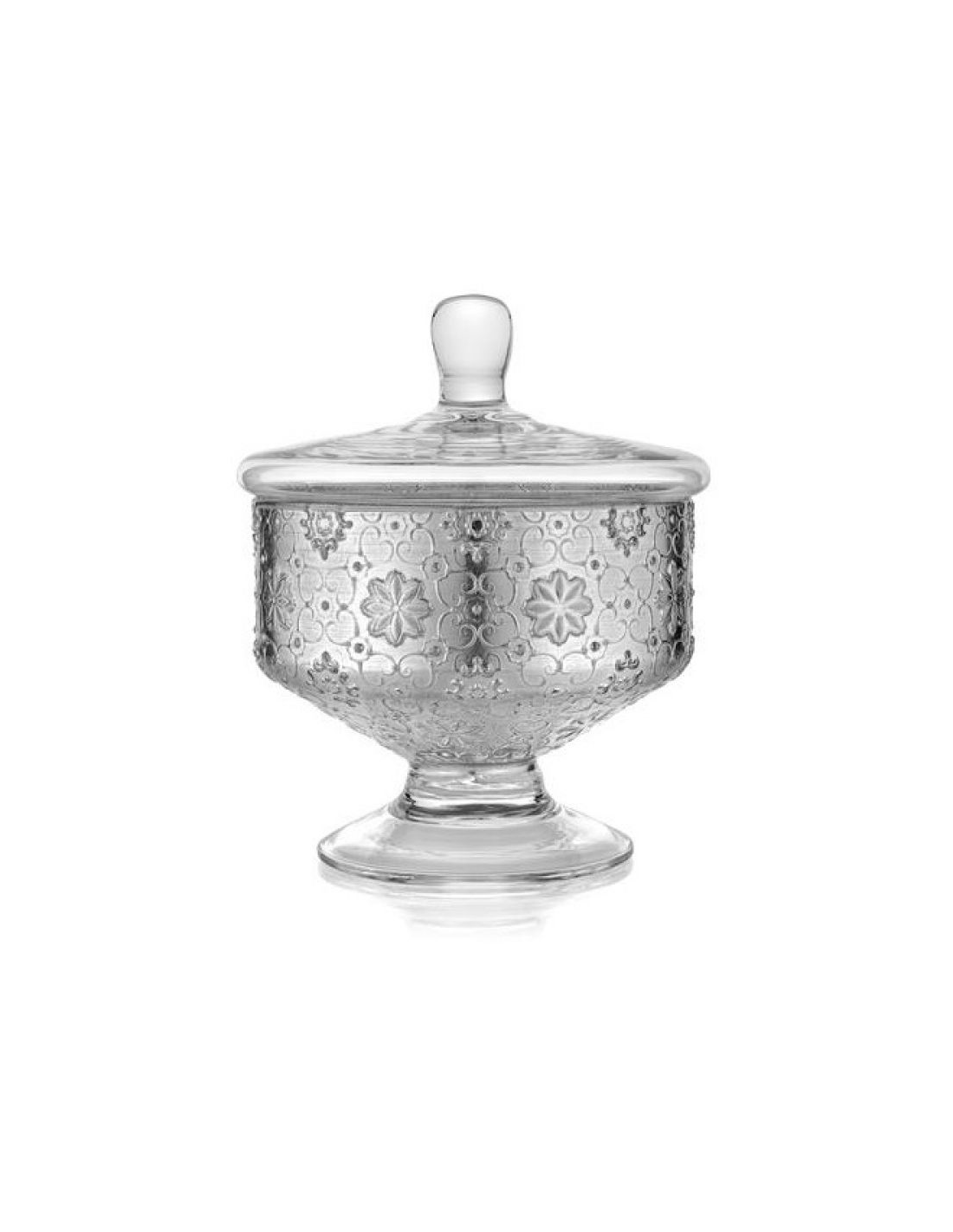 Porta cioccolatini in vetro pressato trasparente e decorato.
