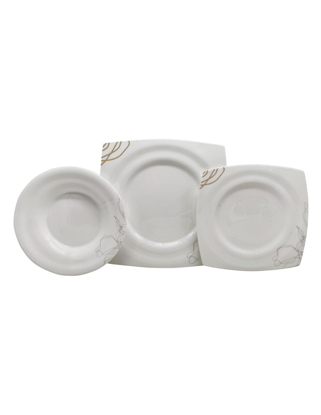 Servizio in porcellana Fine Bone China con decorazione simil floreale e filo oro.