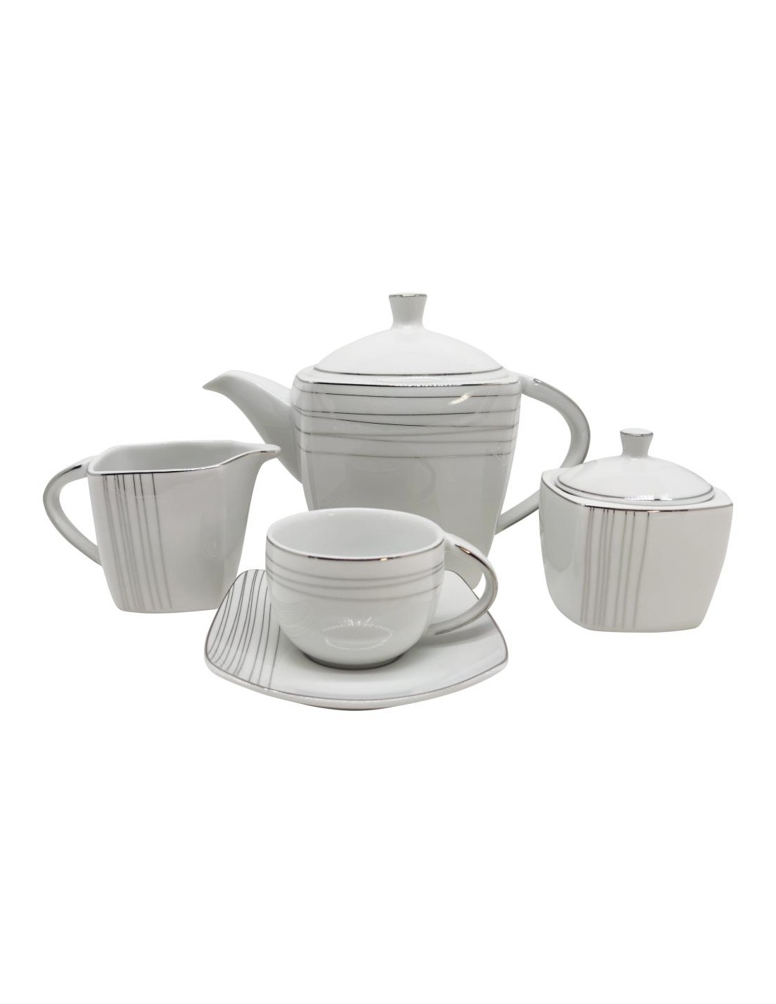 Servizio the in porcellana con decoro e bordo in filo platino, per 6 persone composto da: