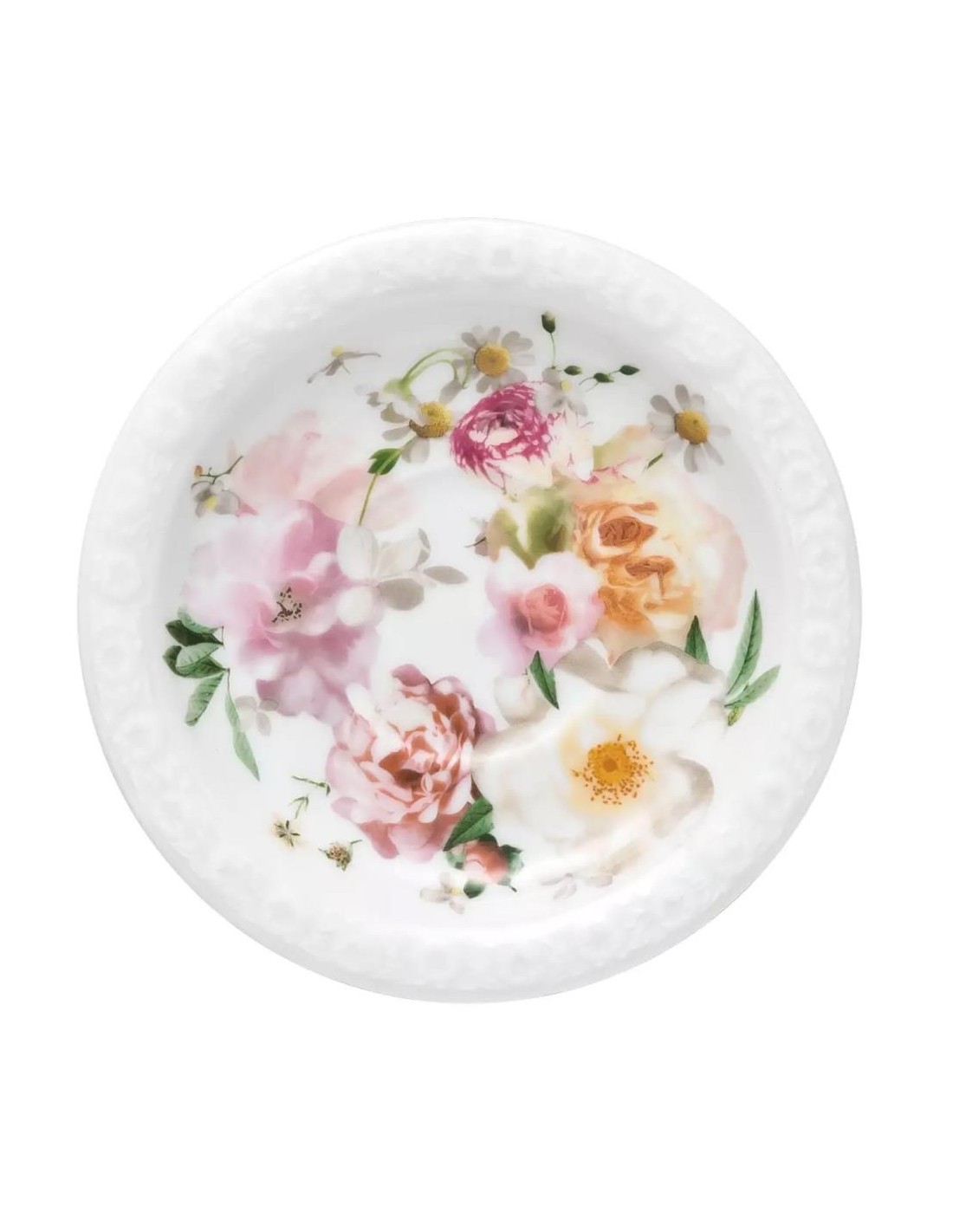 La designer svizzera Regula Stüdli ha sparso generosamente teneri fiori e foglie su una fine superficie bianca di porcellana: rose rosa, margheritine giallo chiaro, foglie verdi.
