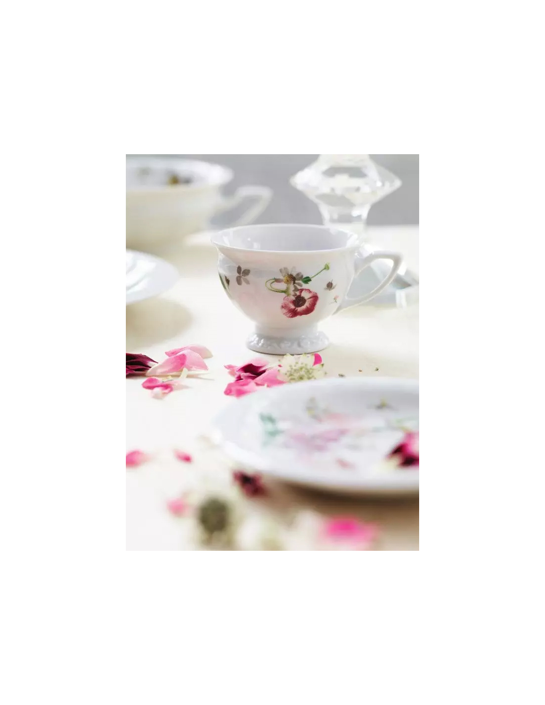 Delicate e vellutate, le immagini floreali avvolgono tazze, piatti e teiere di porcellana – isolate, in ghirlande o a gruppi.
