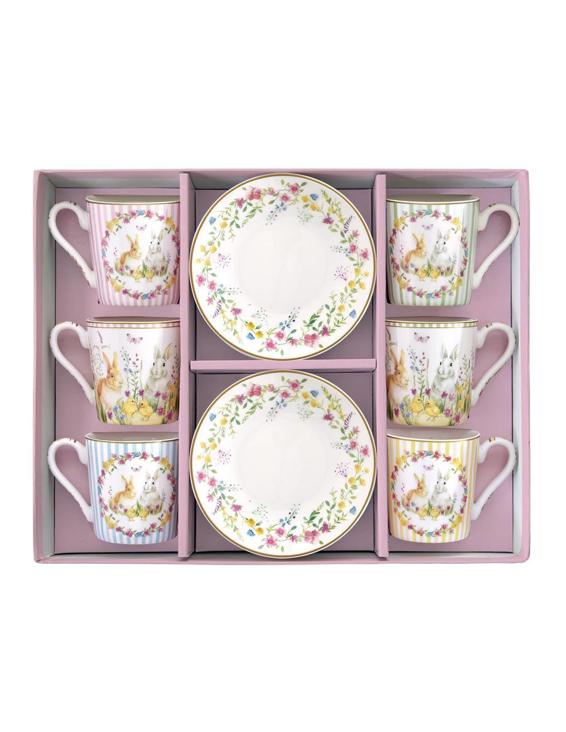 Ogni tazza è decorata con raffinati motivi pasquali, tra cui dolci coniglietti, fiori primaverili e uova colorate, perfetti per creare un’atmosfera festosa.