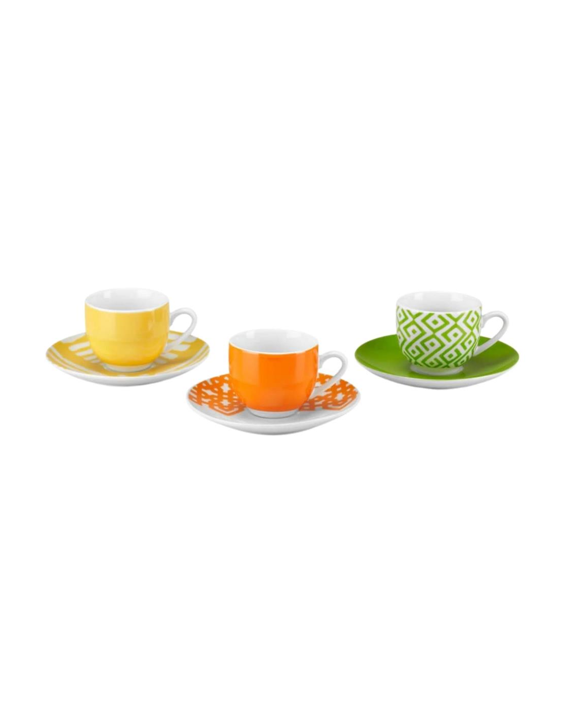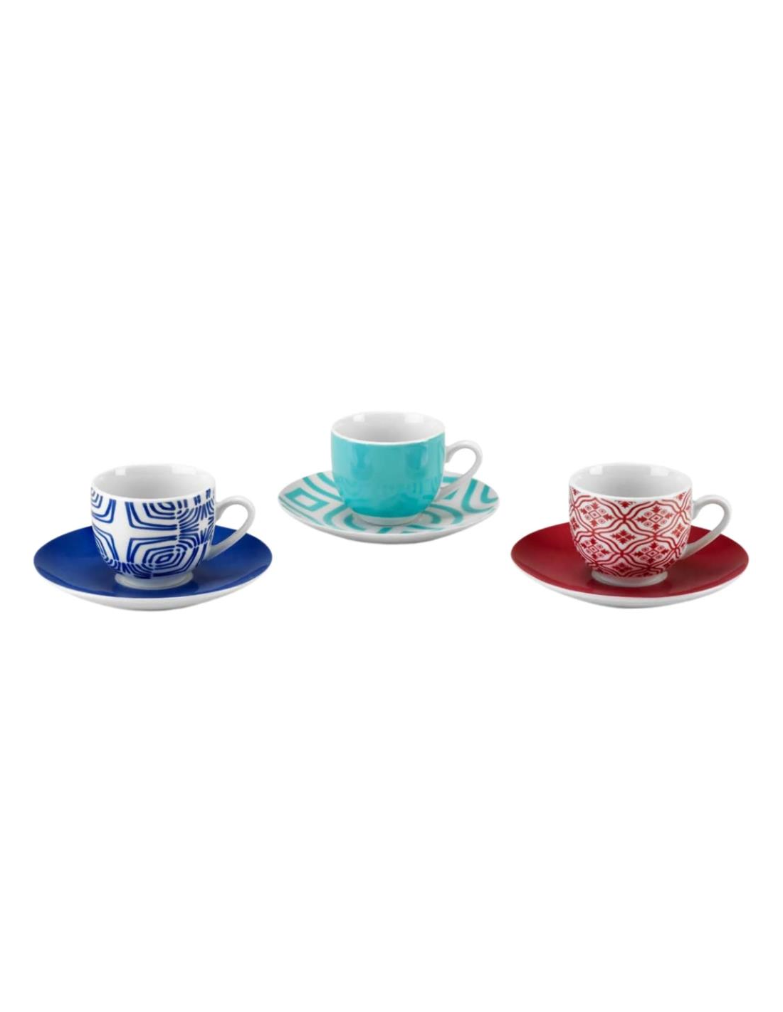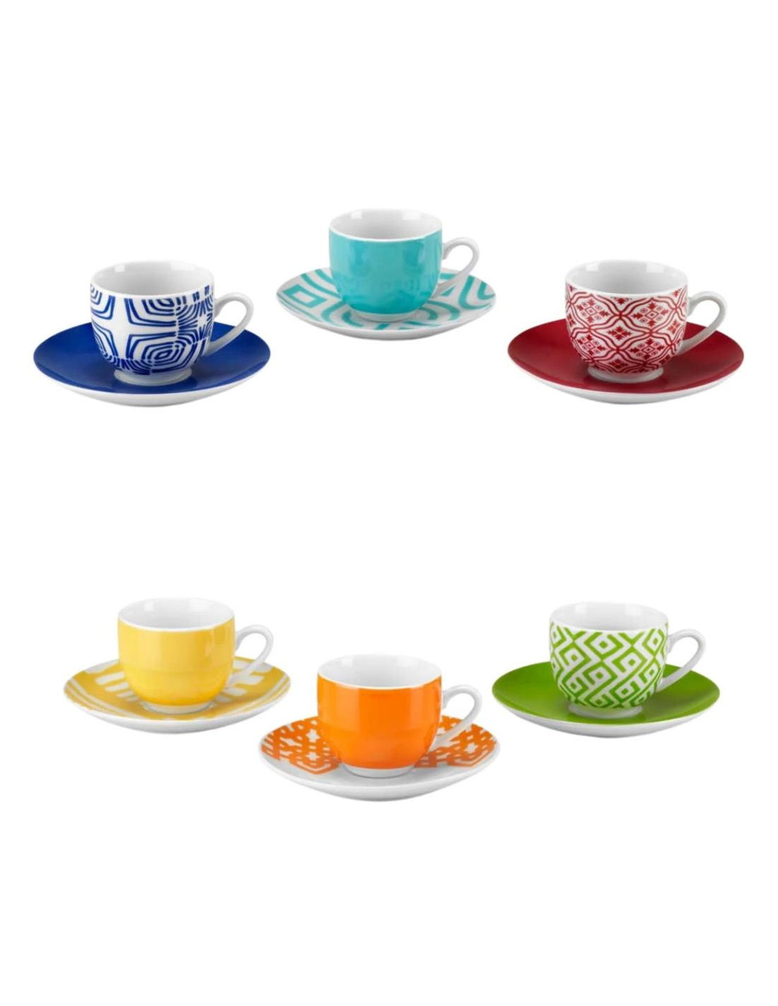 Set 6 tazzine caffè con piattino abbinato, in porcellana decorata da un design geometrico e dai colori assortiti.