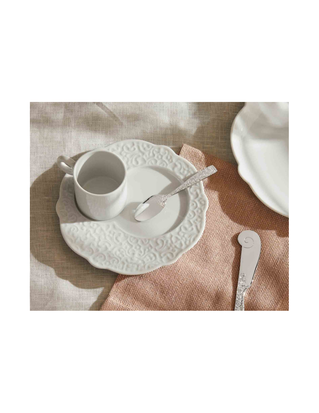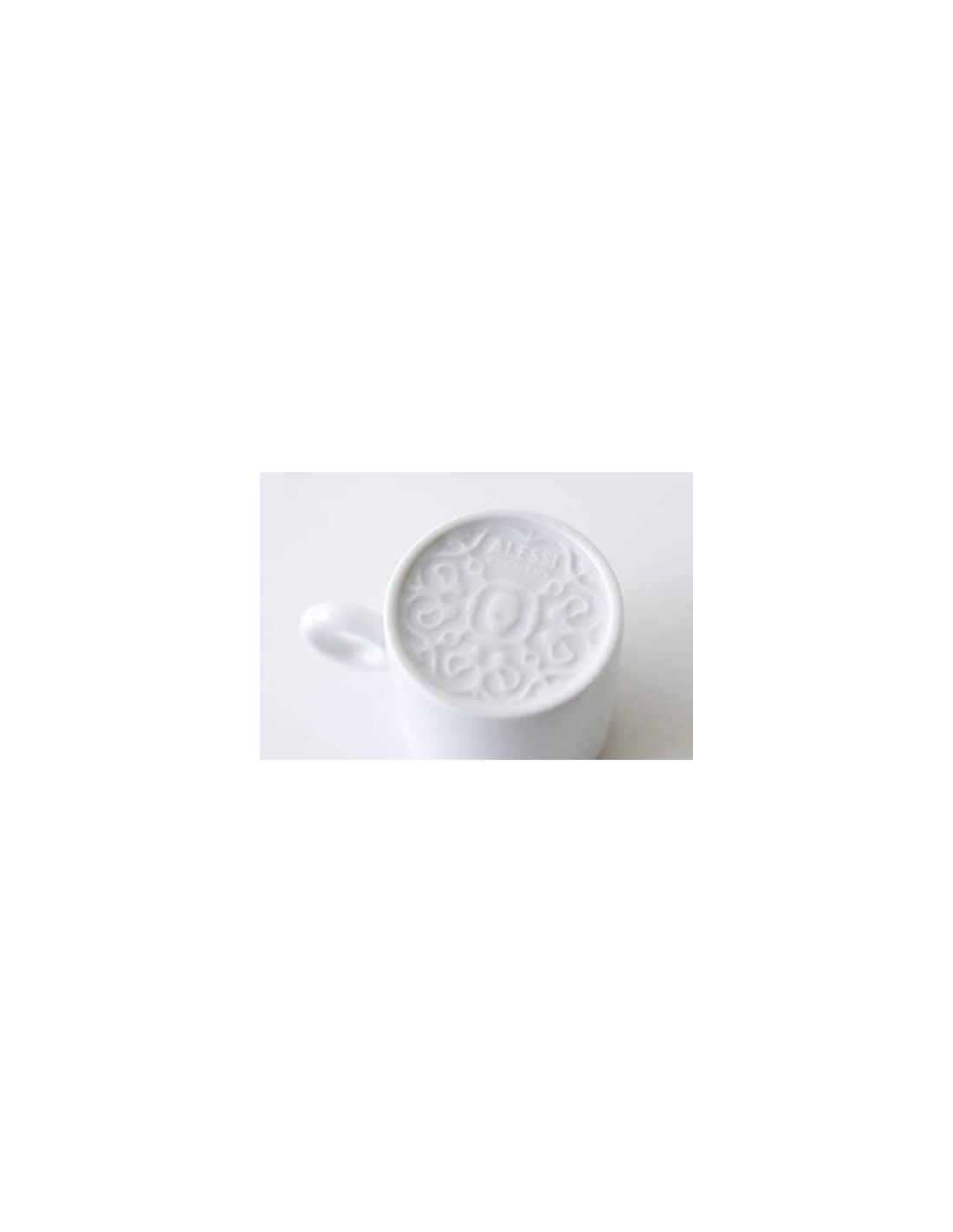 Tazza da caffè in porcellana bianca con decoro a rilievo sul fondo. (Senza