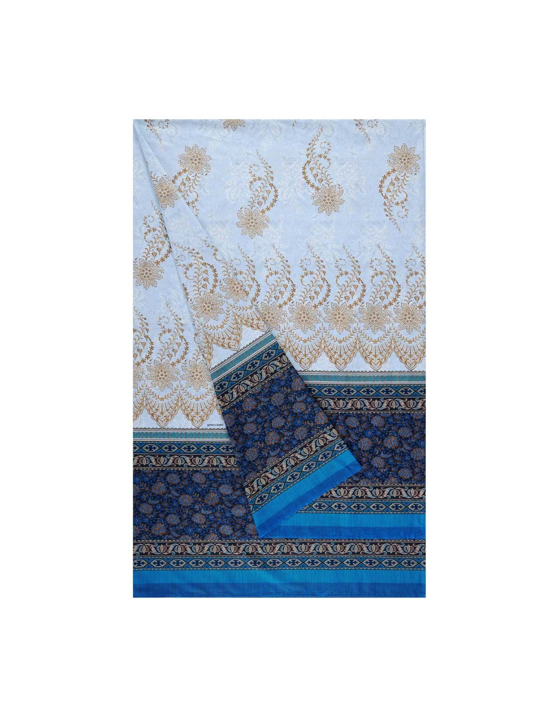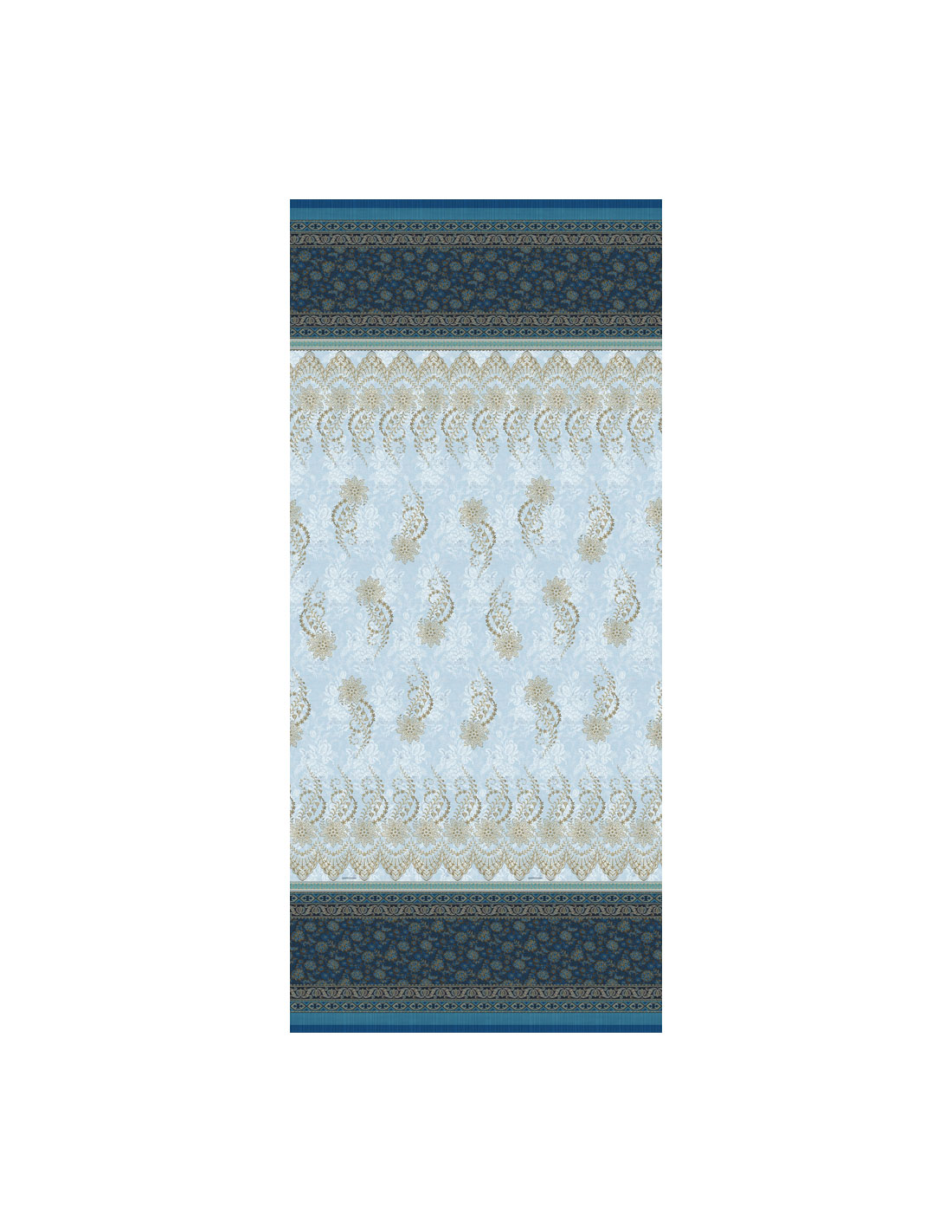 variante più fresca mostra sfumature di celeste con dettagli in oro e un bordo
