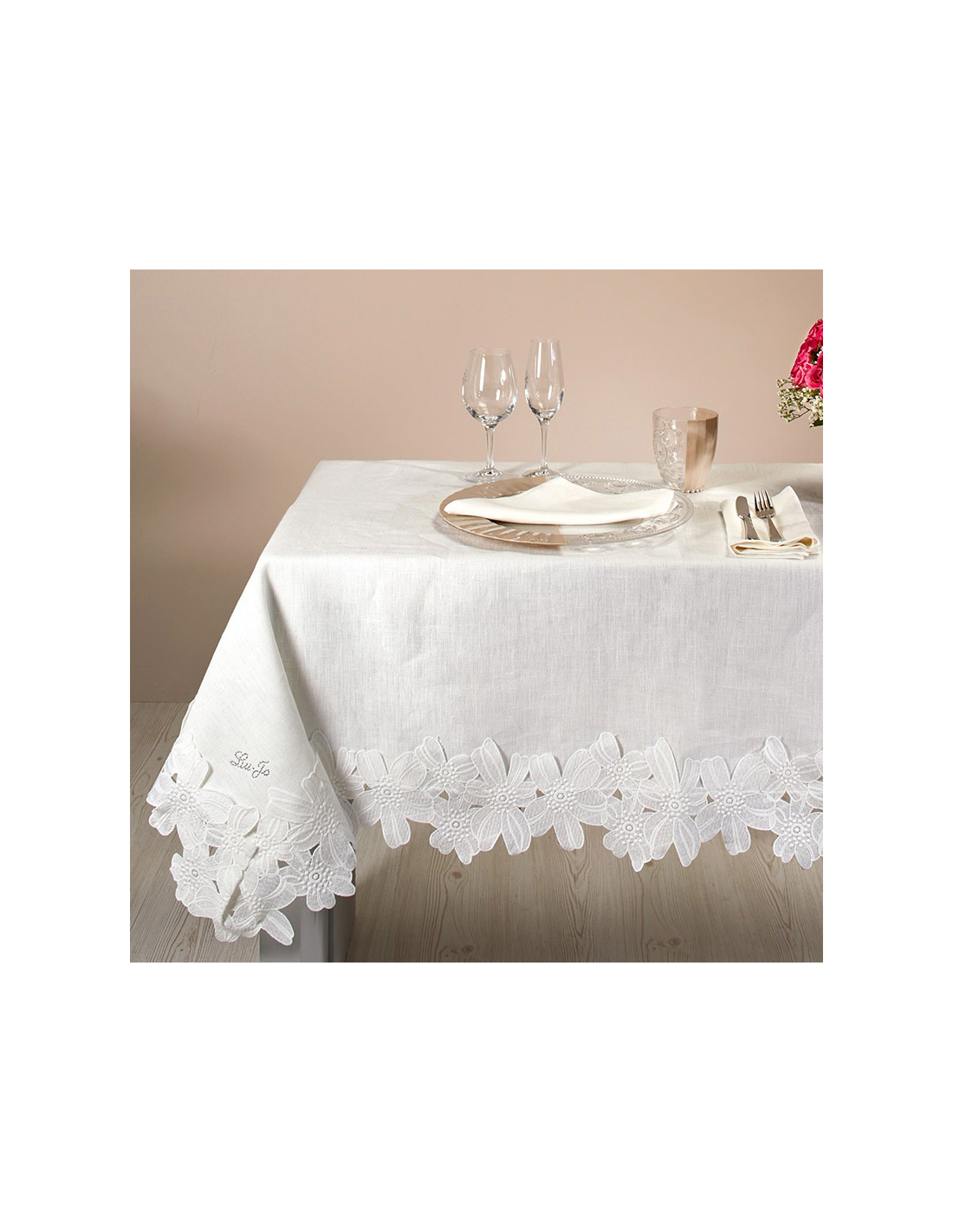 Tovaglia Liu Jo linea Corolla in puro Lino rifinito con pizzo e logo in swarovski.